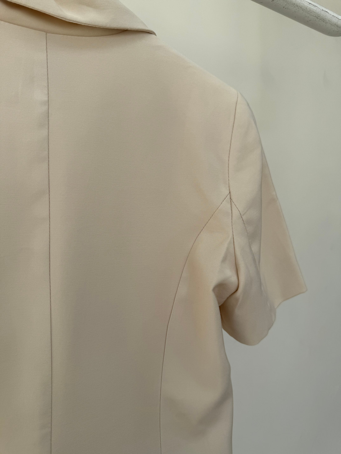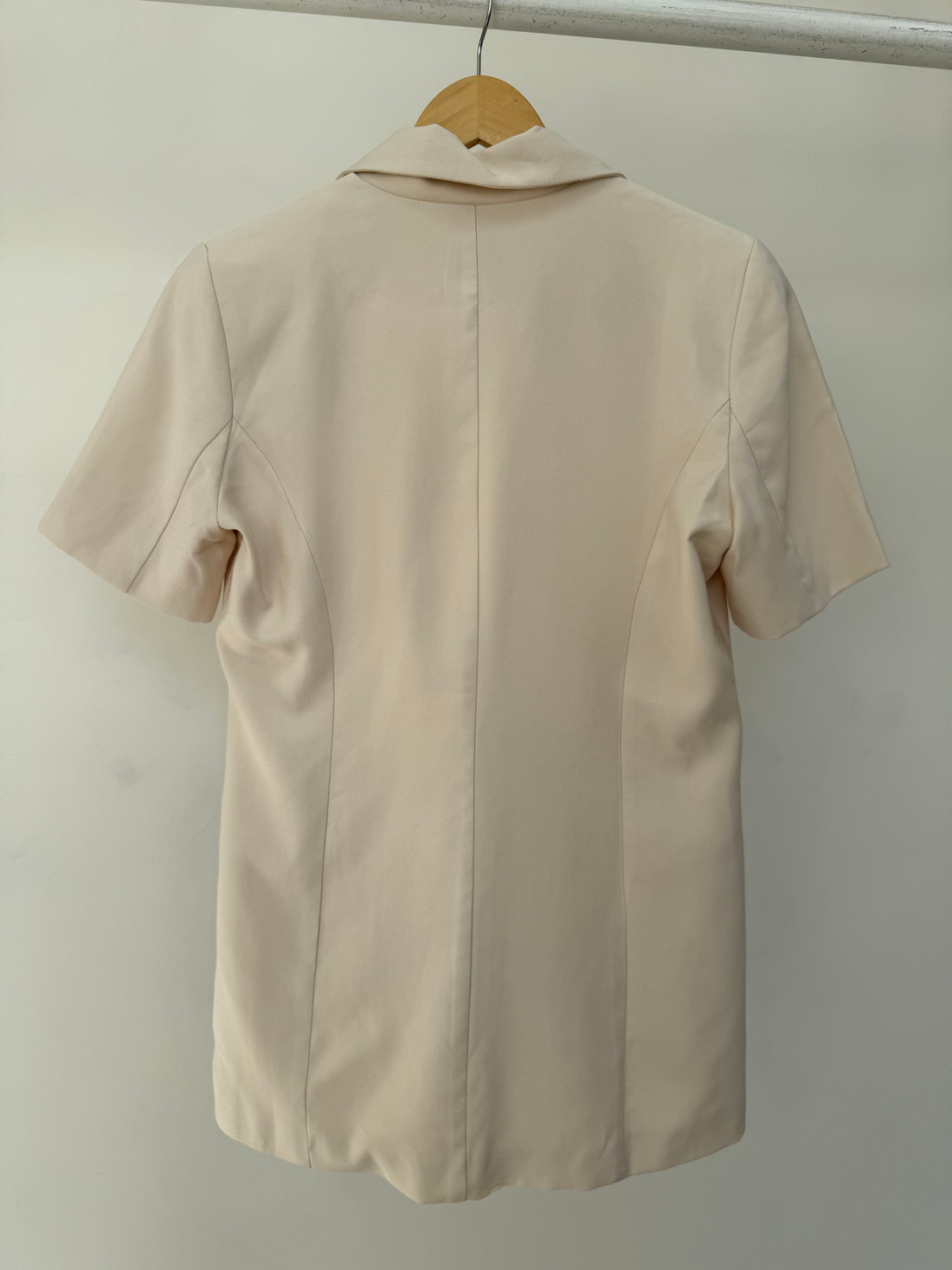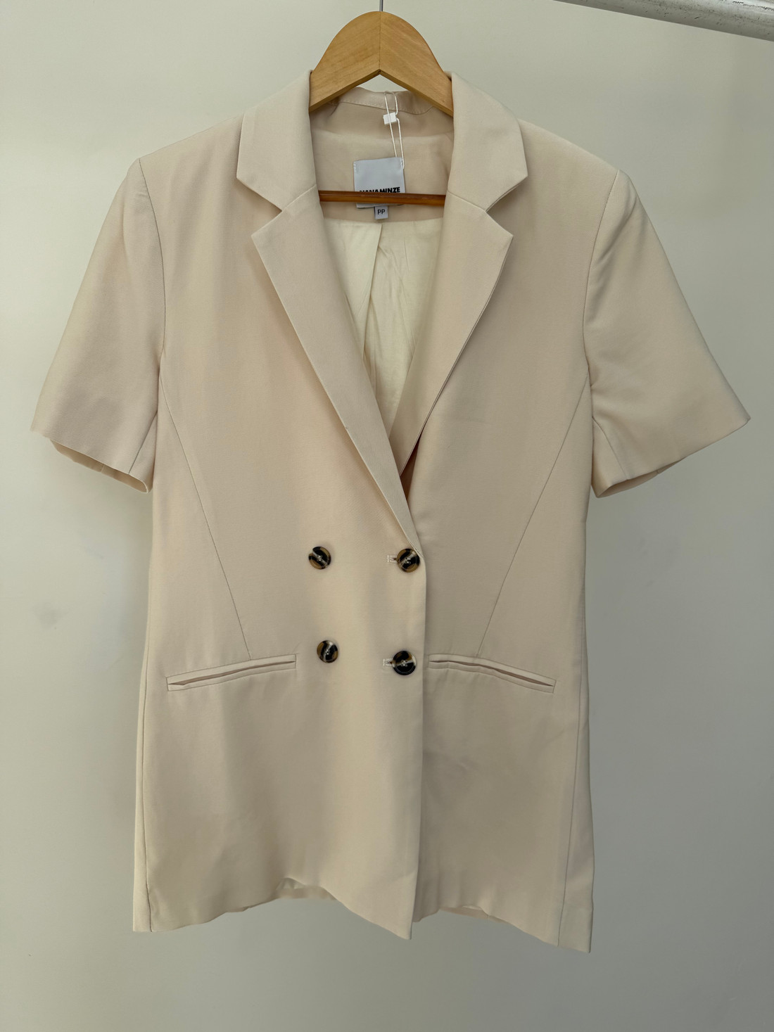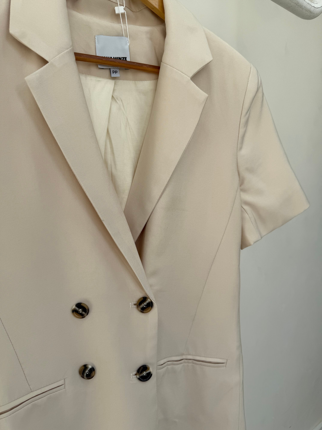Confeccionado em alfaiataria Twill Fluido, um tecido de caimento leve, toque macio e aparência sofisticada, o blazer de manga curta Mia combina elegância e conforto em medida ideal. Com gola notched, mangas curtas e pences de ajuste frontais e posteriores, valoriza a silhueta de forma natural e moderna. Perfeito para produções refinadas, mas com ar leve e despretensioso, ideal para transitar entre o casual chic e o elegante do dia a dia. Conta ainda com forro interno, bolsos sociais, fechamento por botões na vista e comprimento alongado, que confere um toque contemporâneo e versátil à peça.