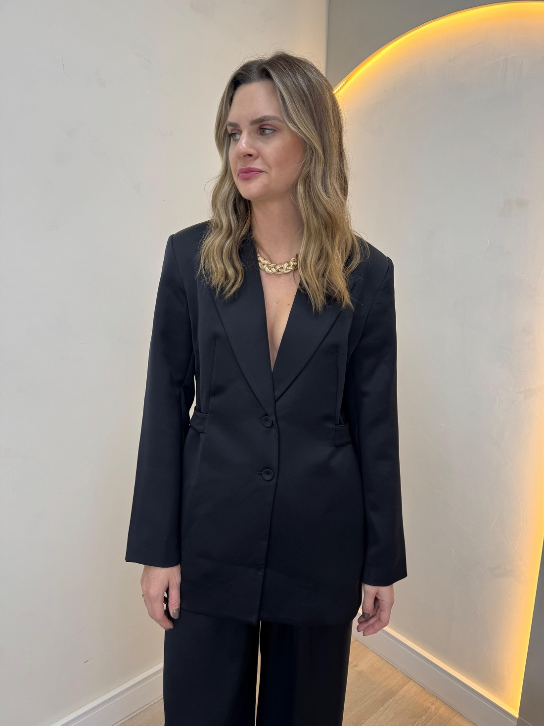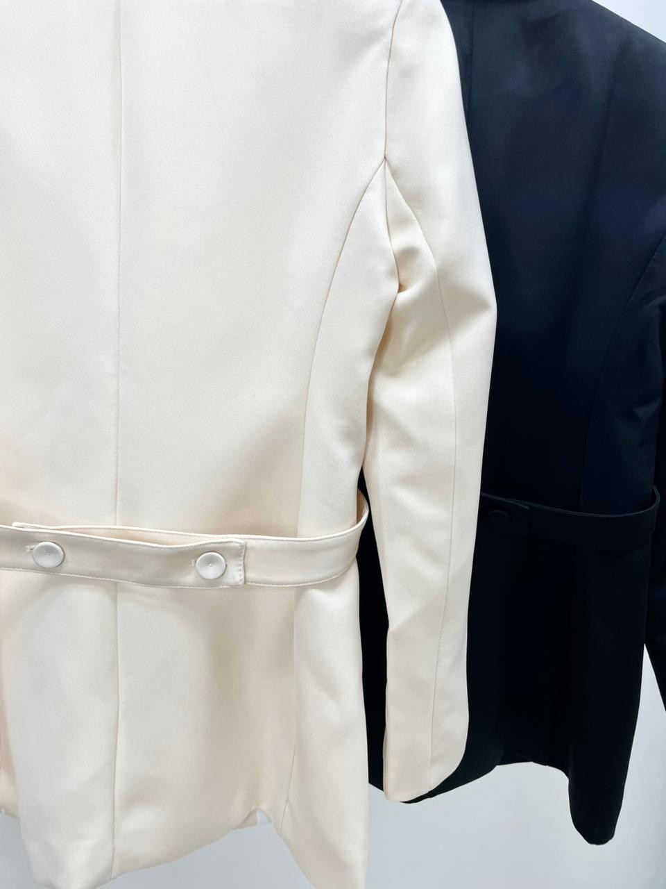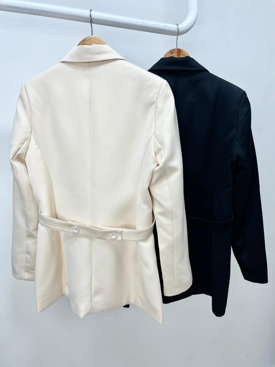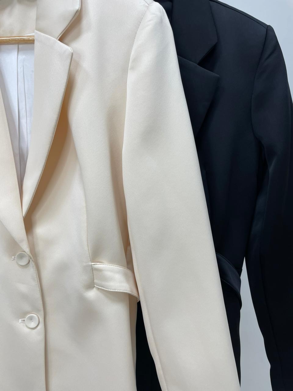 O Blazer em Alfaiataria Eclair é a definição de sofisticação atemporal com um toque moderno. Confeccionado em crepe de alfaiataria acetinado — tecido com um lado creponado e outro acetinado — proporciona um toque macio e visual refinado. Com gola notched (lapela clássica), fechamento frontal por botão e mangas longas, a peça apresenta caimento estruturado e corte impecável, valorizando a silhueta com elegância. O forro de cetim embutido garante conforto ao vestir, enquanto as pences no busto e a tira de ajuste na cintura com botão nas costas oferecem um caimento personalizado e feminino. Versátil e refinado, é ideal tanto para composições formais quanto para looks modernos com personalidade.