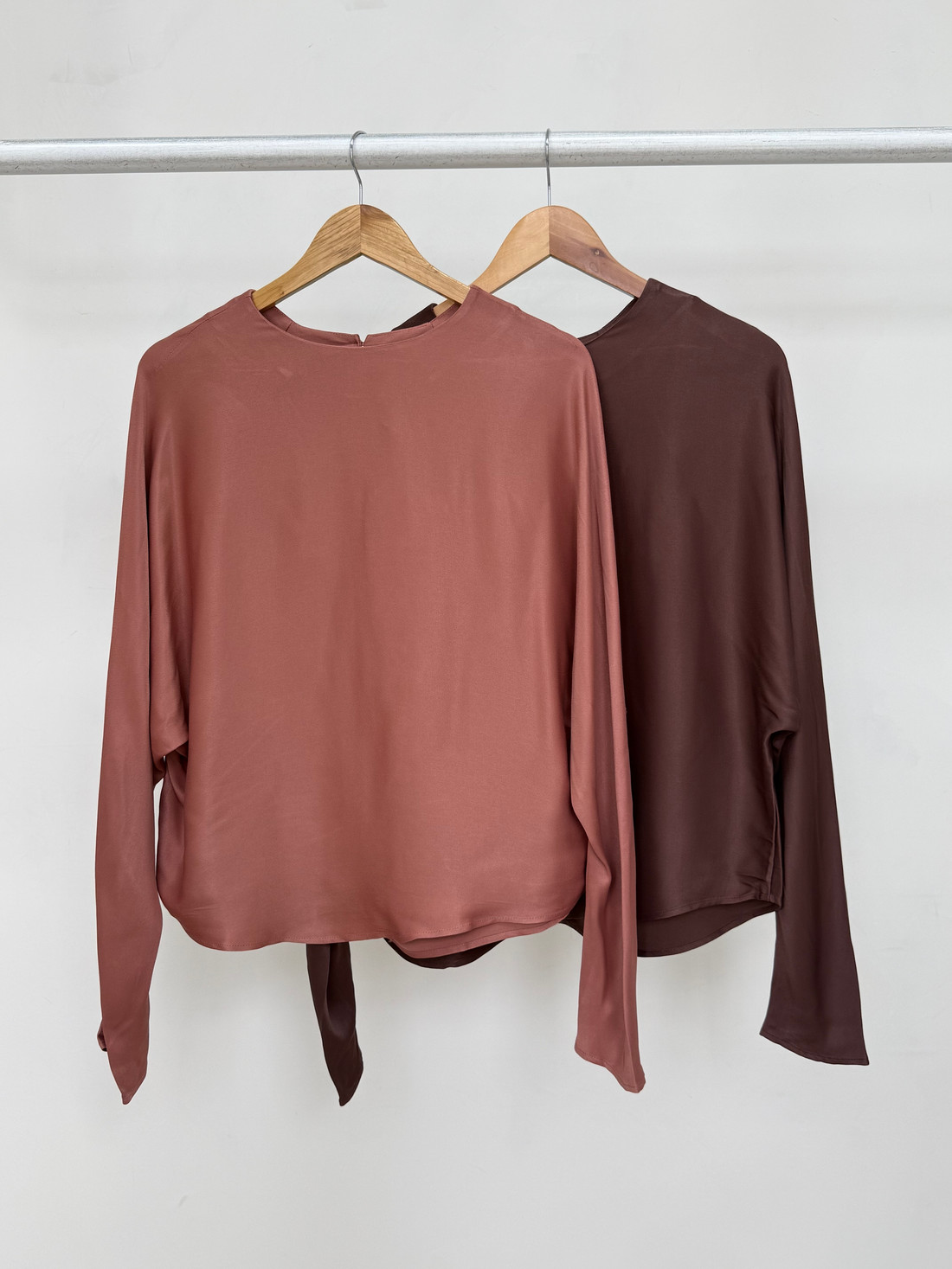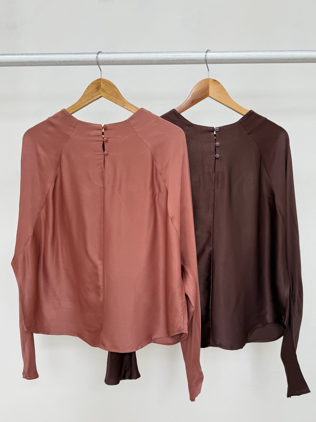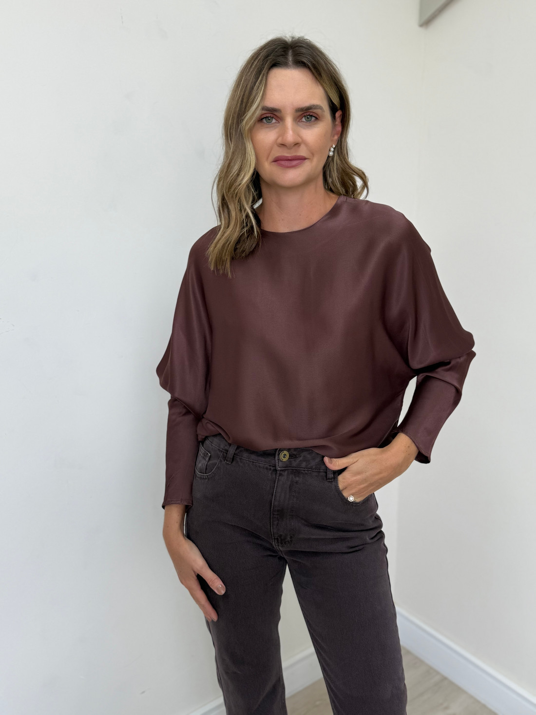 Confeccionada em cetim, tecido de superfície lisa e brilho sutil, esta peça se destaca pelo toque macio e pelo visual sofisticado. Seu caimento fluido proporciona movimento delicado, garantindo um acabamento leve e elegante. A blusa possui decote arredondado, mangas longas no estilo morcego e fechamento nas costas com detalhe em gota e botão. A modelagem ampla valoriza o conforto sem abrir mão da sofisticação, criando uma silhueta moderna e atemporal. Elegante e versátil, é ideal para composições que equilibram praticidade e refinamento, transitando com facilidade entre diferentes ocasiões.
