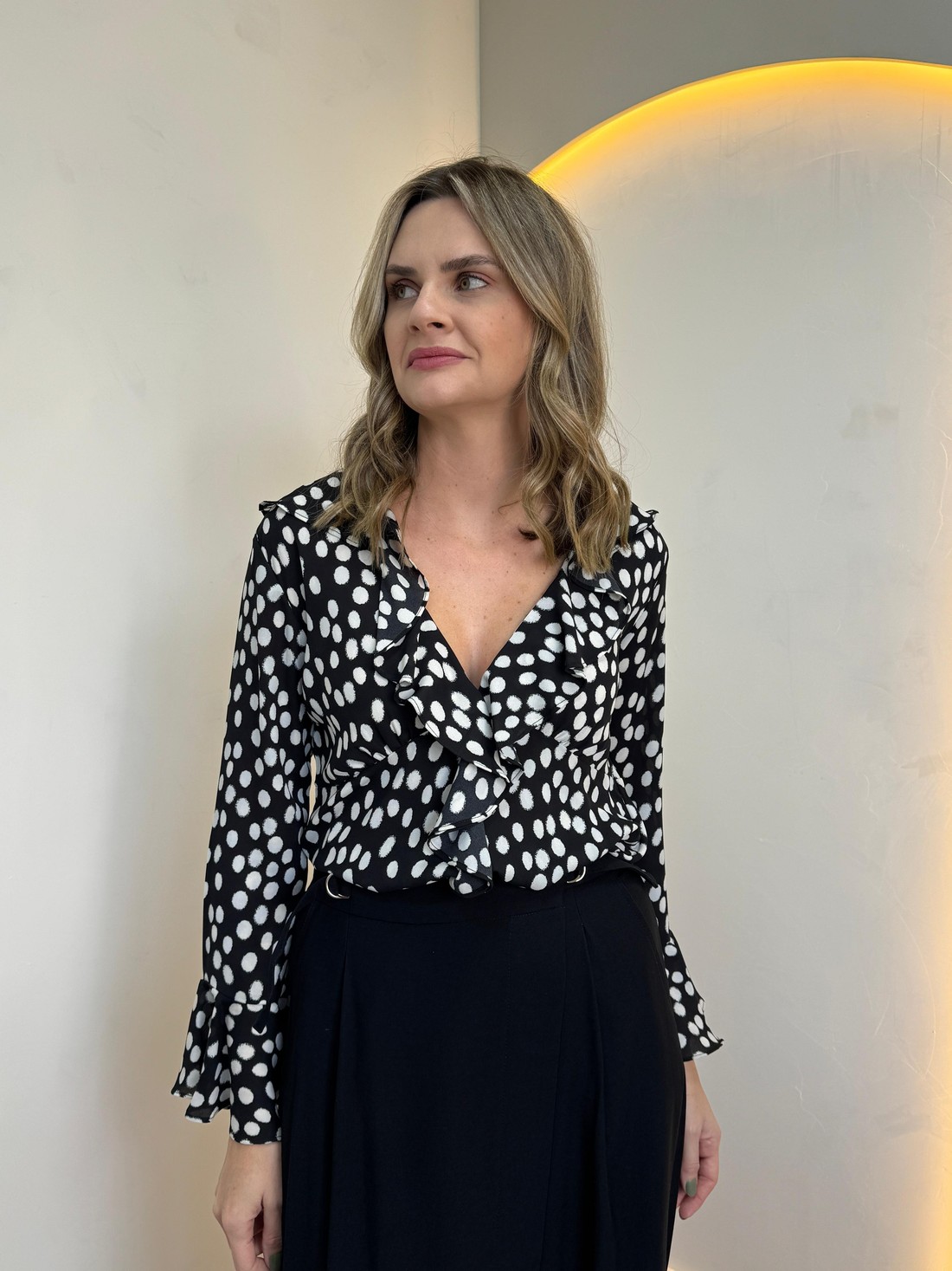 Adicione um toque de charme e sofisticação ao seu guarda-roupa com a blusa de Poá Alicia. Confeccionada em crepe, a peça apresenta estampa poá moderna em tons contrastantes de branco sobre o fundo preto, proporcionando um visual clássico com um toque contemporâneo.O destaque fica por conta do decote em "V" com delicados babados, que trazem movimento e feminilidade à produção. As mangas longas com punhos levemente franzidos e acabamento em babado adicionam ainda mais delicadeza e estilo.