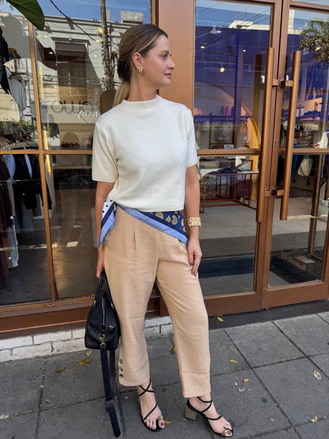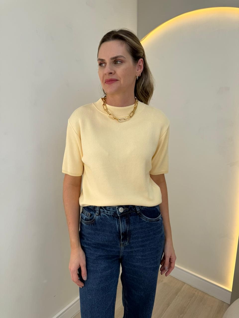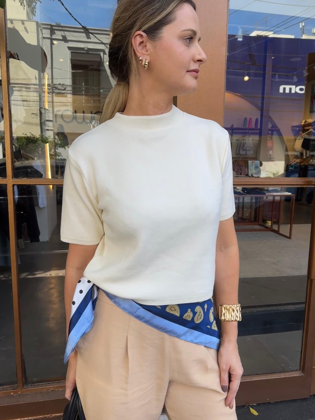 A blusa de tricot Érica é a escolha perfeita para quem busca aliar conforto, estilo e versatilidade. Confeccionada em tricot leve e de toque macio, essa peça apresenta uma modelagem levemente reta que valoriza diferentes silhuetas, sendo ideal para composições do casual ao sofisticado. Seu design clean ganha destaque com a gola estilo canoa levemente alta, que traz um toque contemporâneo ao visual. As mangas curtas proporcionam frescor e liberdade de movimentos, tornando a peça perfeita para todas as estações. O acabamento da barra e das mangas possui textura canelada, que garante melhor caimento e durabilidade à peça. Não acompanha o lenço.