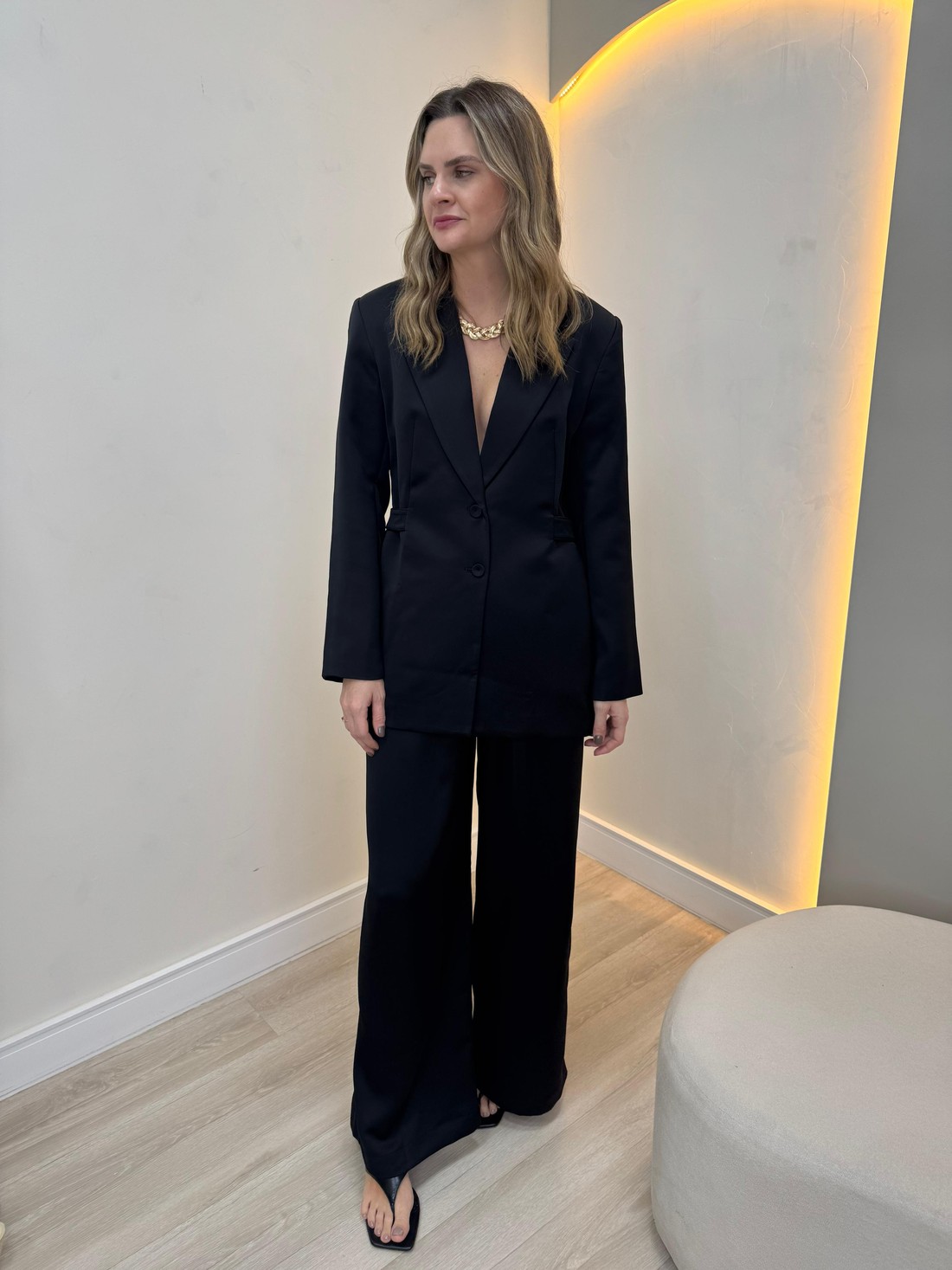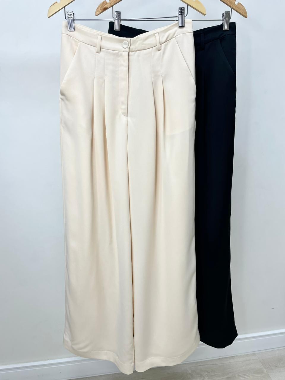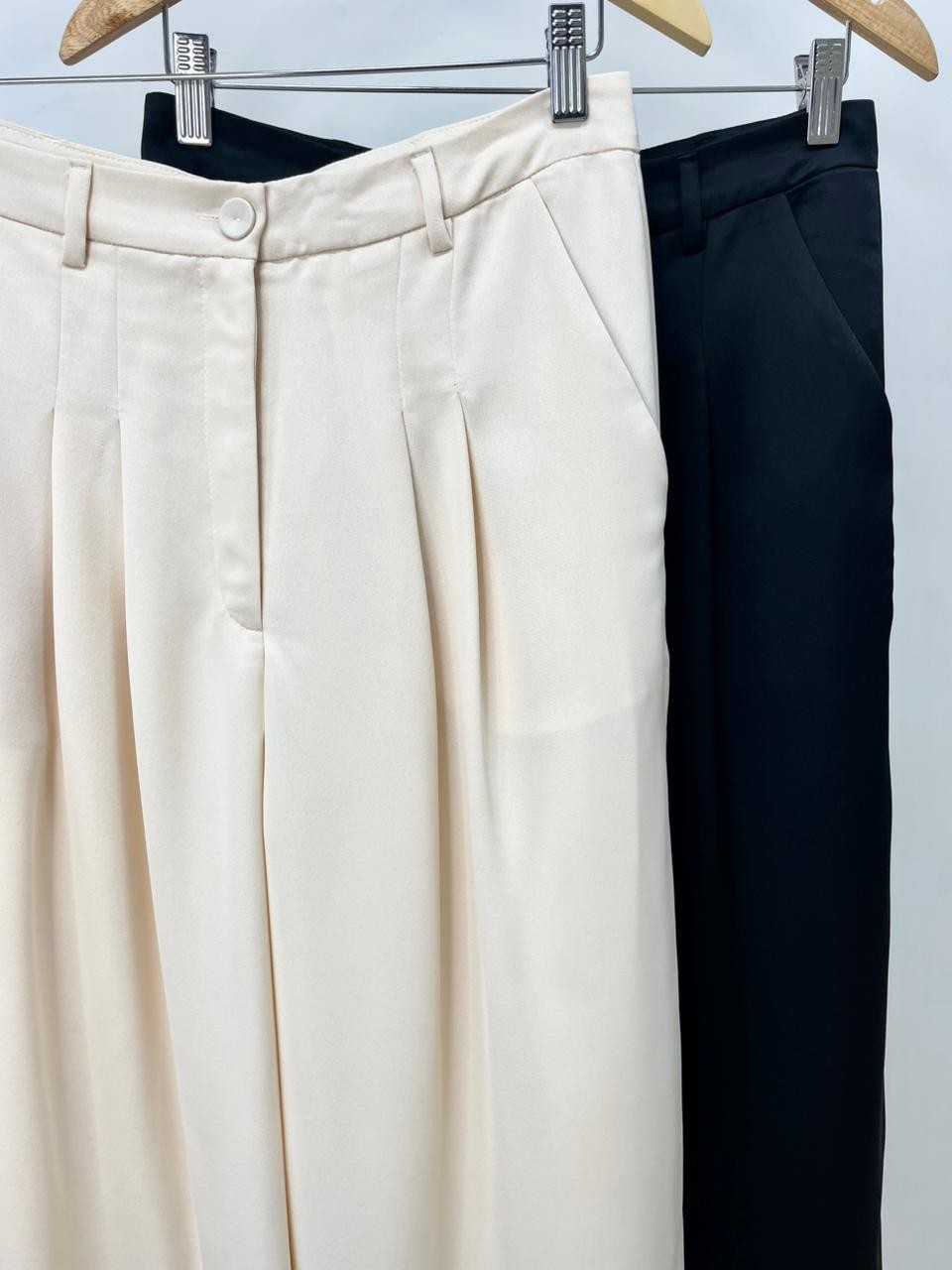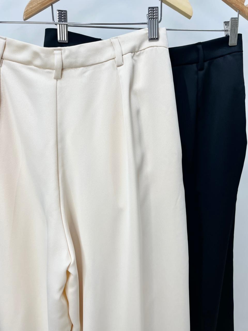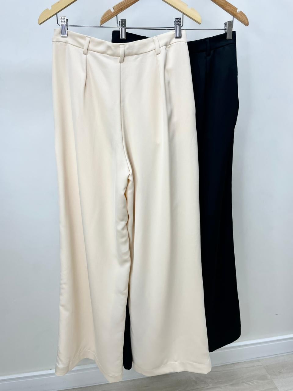 Elegância e conforto em perfeita harmonia. Confeccionada em crepe de alfaiataria acetinado, a calça em Alfaiataria Eclair traz um toque sofisticado e agradável à pele, com um visual único: um lado com textura creponada e o outro com acabamento acetinado — discreto, porém marcante. Sua modelagem ampla proporciona liberdade de movimento e um caimento elegante. O cós com passantes e fechamento por zíper e botão garante praticidade e bom ajuste. Os detalhes das pregas pespontadas, bolso faca e pences traseiras elevam o acabamento da peça, reforçando sua proposta refinada. Ideal para composições versáteis — do look de trabalho à produção mais elaborada com salto ou até mesmo com flats para um visual casual chic.