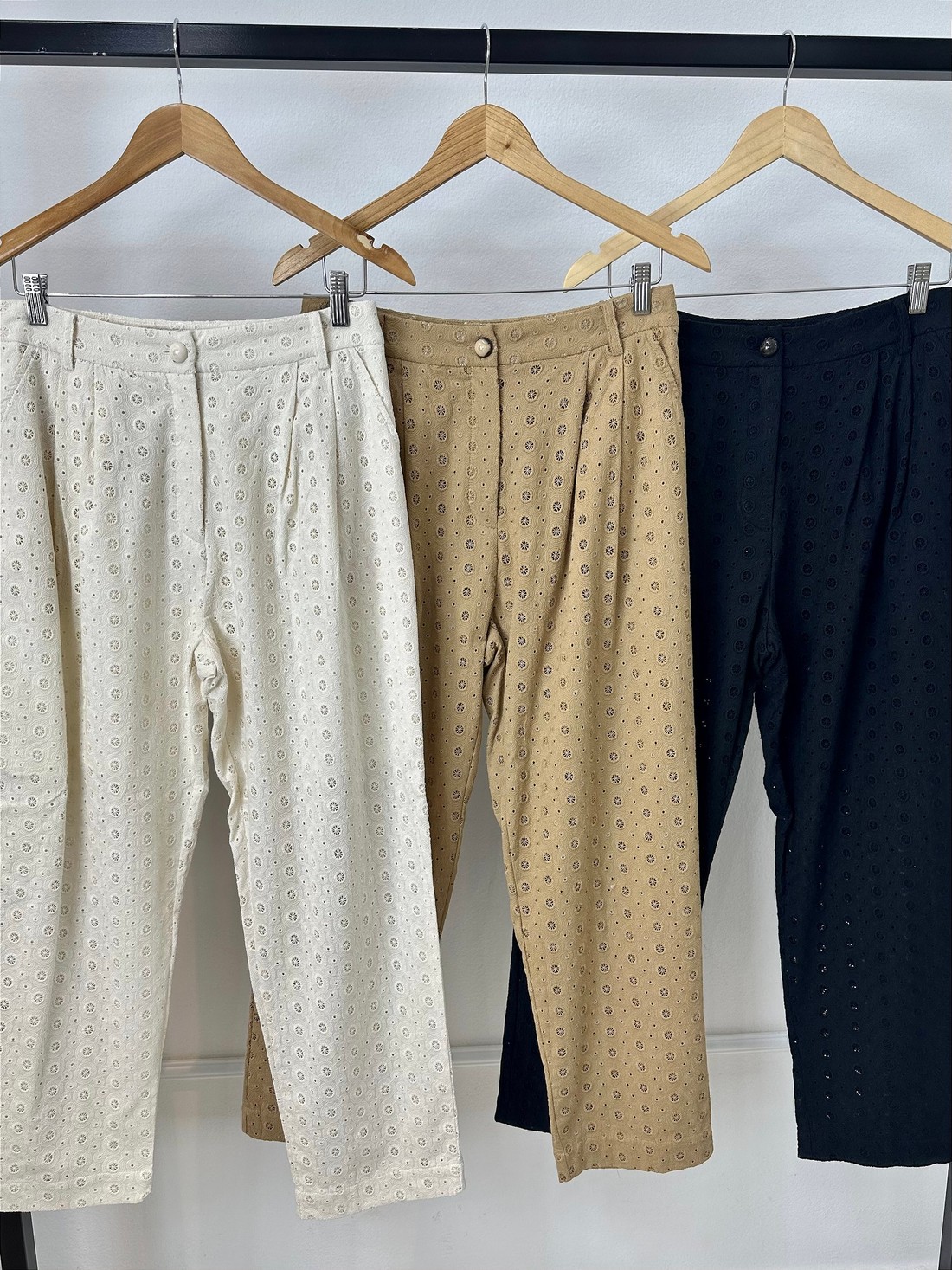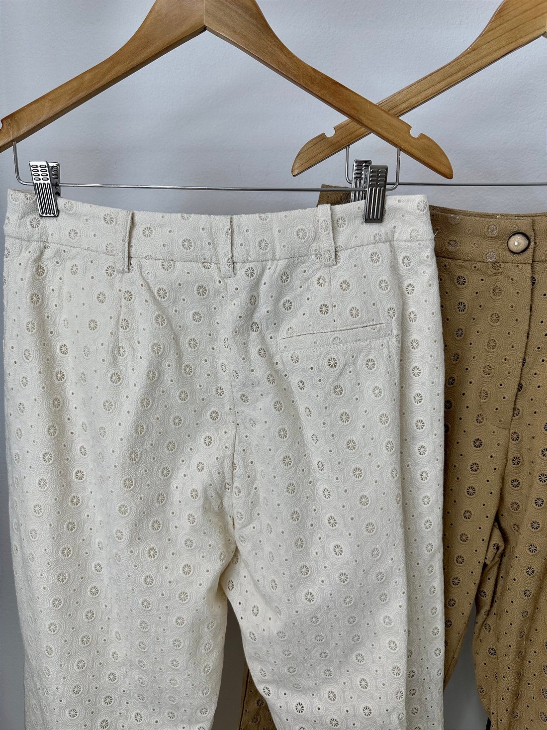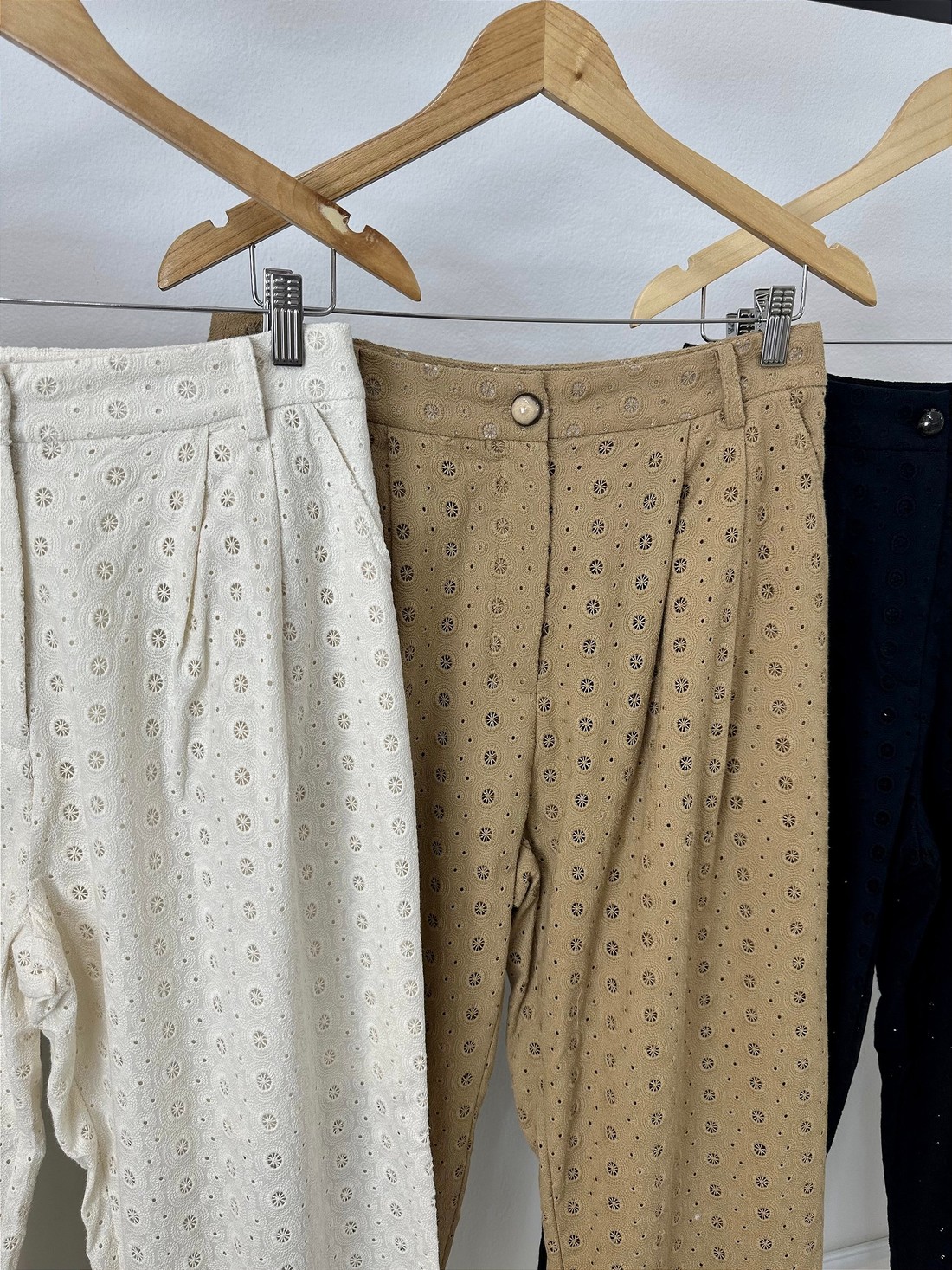 Calça produzida em renda. Possui tecido texturizado leve, cintura alta, cós com passantes aplicados, fechamento por zíper fixo e botão rajado, bolsos modelo faca, pregas frontais, bolso embutido posterior, pences posteriores, comprimento no lugar, shape solto, barra simples e forro embutido de tafetá.