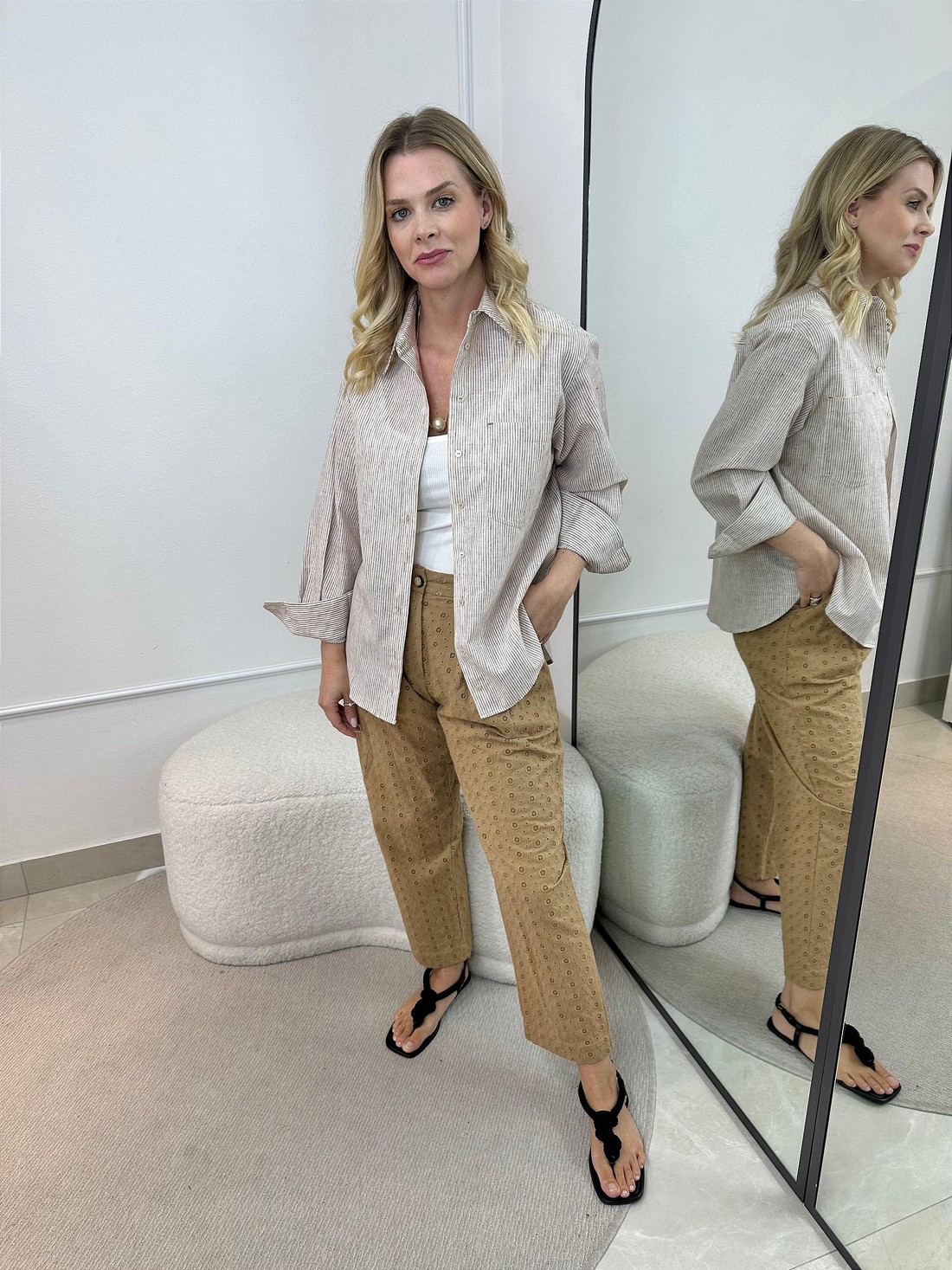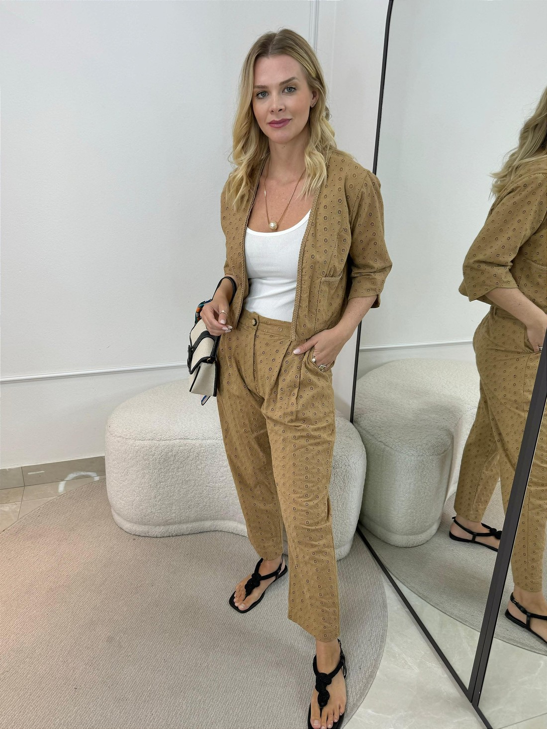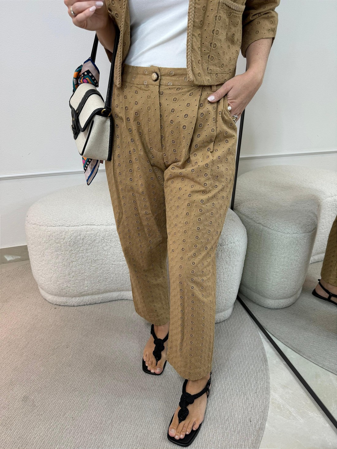 Calça produzida em renda. Possui tecido texturizado leve, cintura alta, cós com passantes aplicados, fechamento por zíper fixo e botão rajado, bolsos modelo faca, pregas frontais, bolso embutido posterior, pences posteriores, comprimento no lugar, shape solto, barra simples e forro embutido de tafetá.