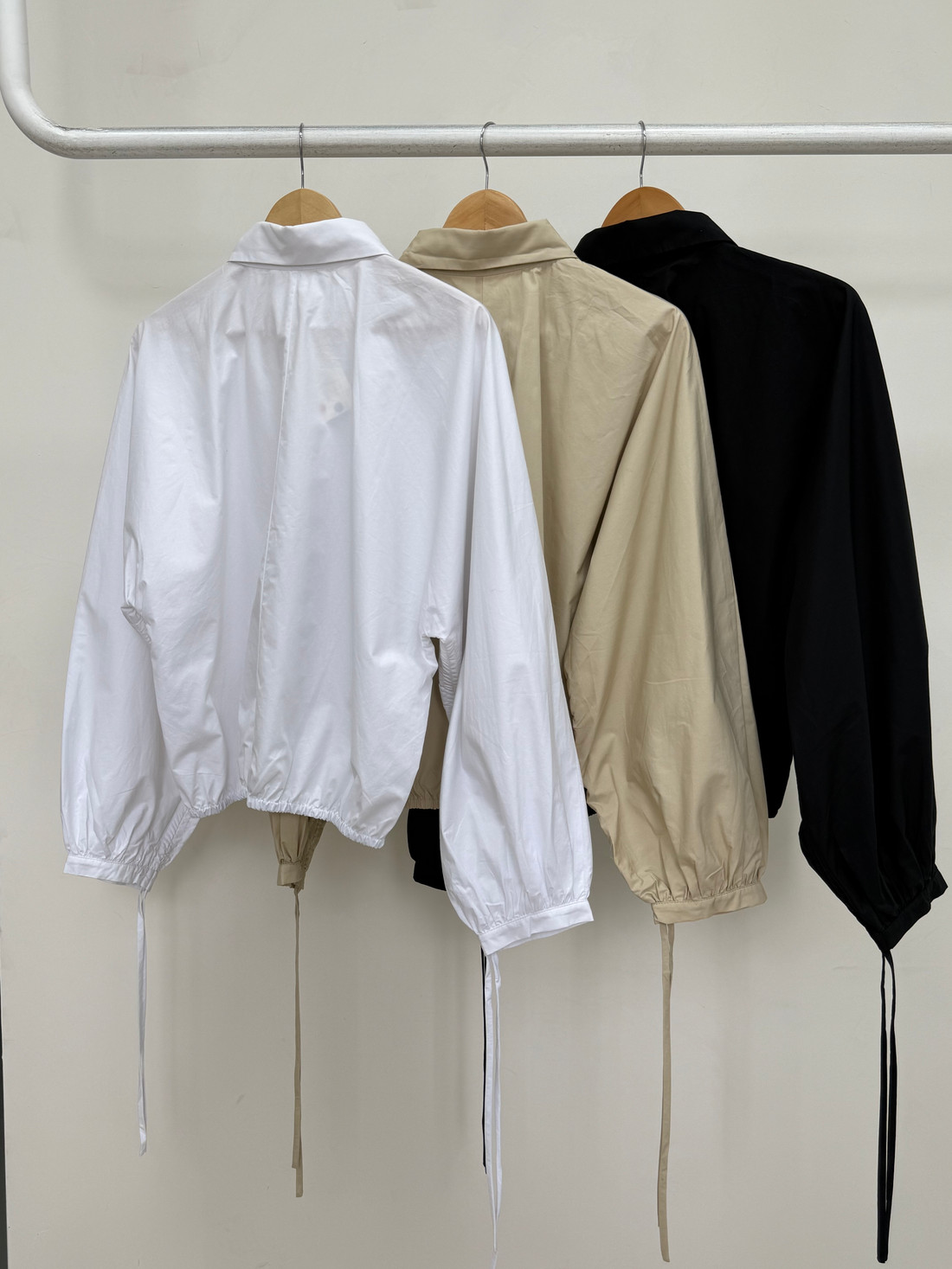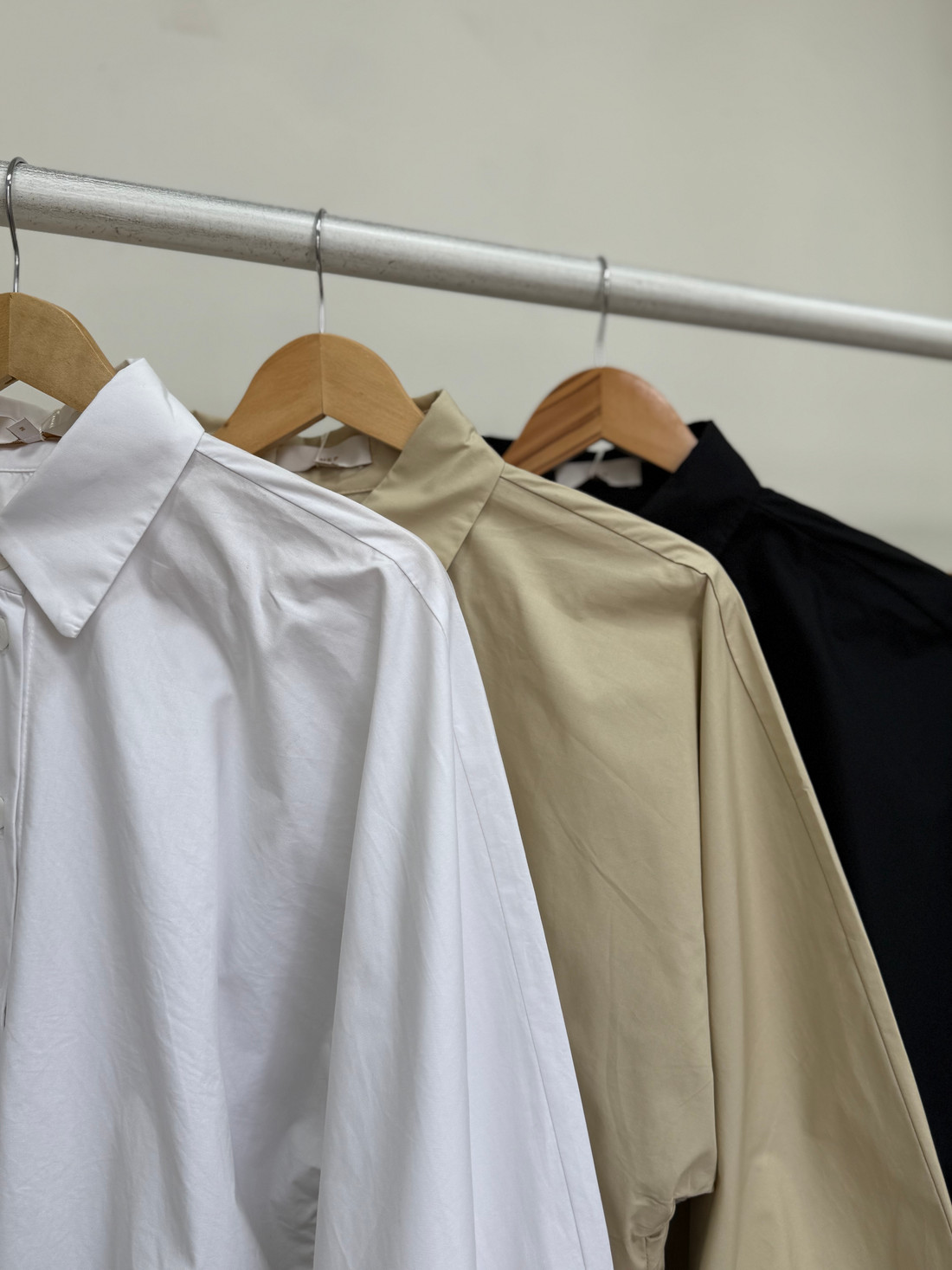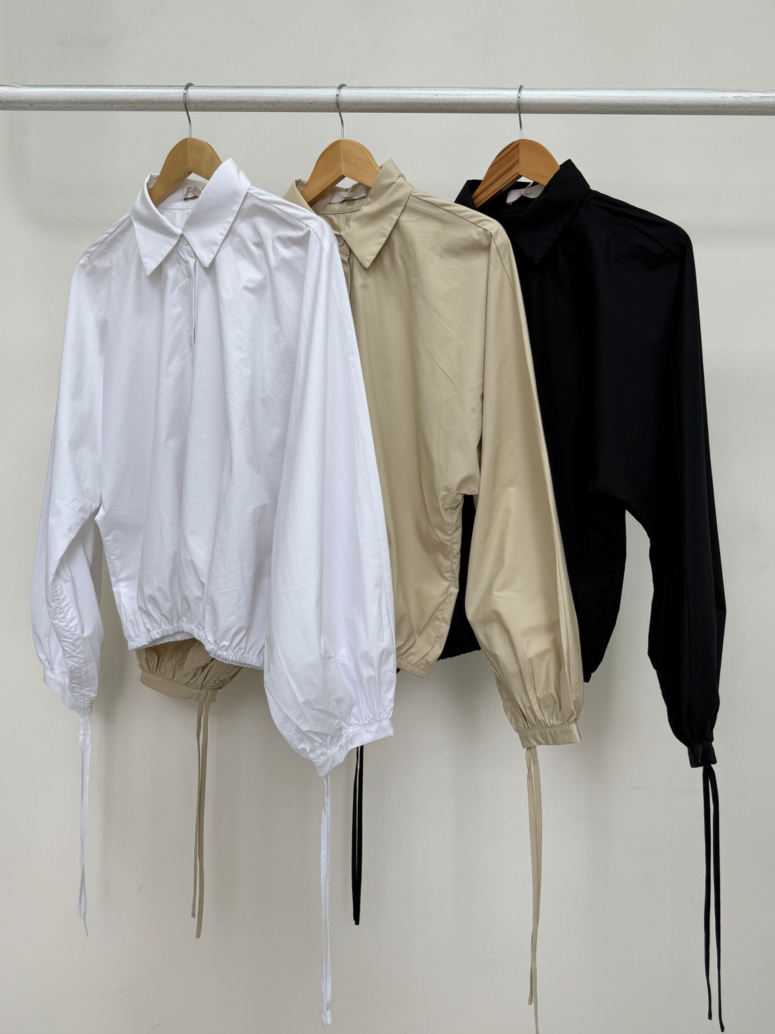 Camisa confeccionada em tricoline, tecido leve, macio e com estrutura. Possui gola clássica e fechamento frontal por botões aparentes. As mangas são longas, com volume levemente bufante e ajuste nos punhos por elástico, criando um efeito franzido delicado. A barra também conta com elástico embutido, proporcionando melhor ajuste ao corpo e um caimento mais moderno. Conta ainda com tiras alongadas nas laterais das mangas, que adicionam um detalhe diferenciado e contemporâneo à peça.