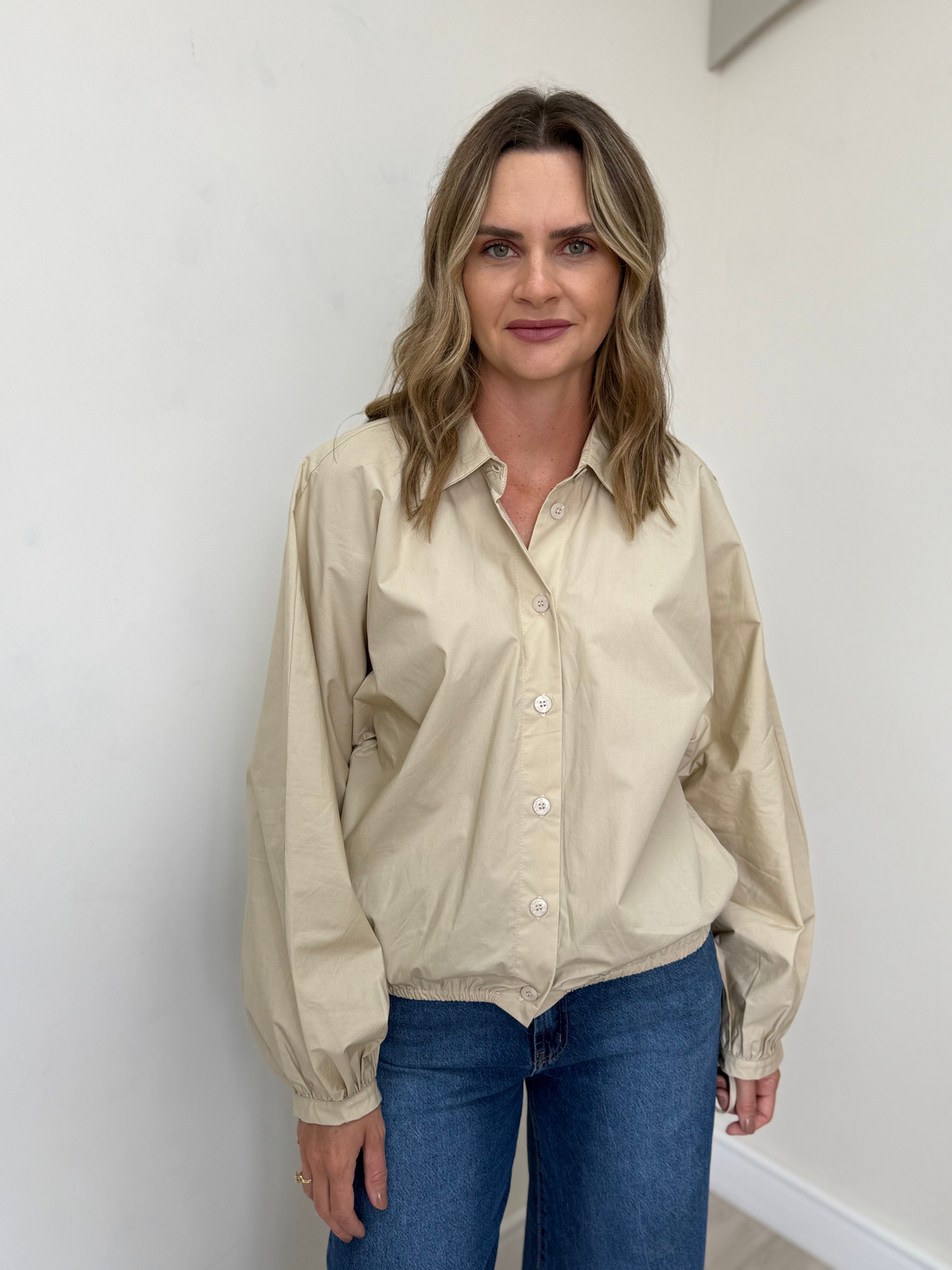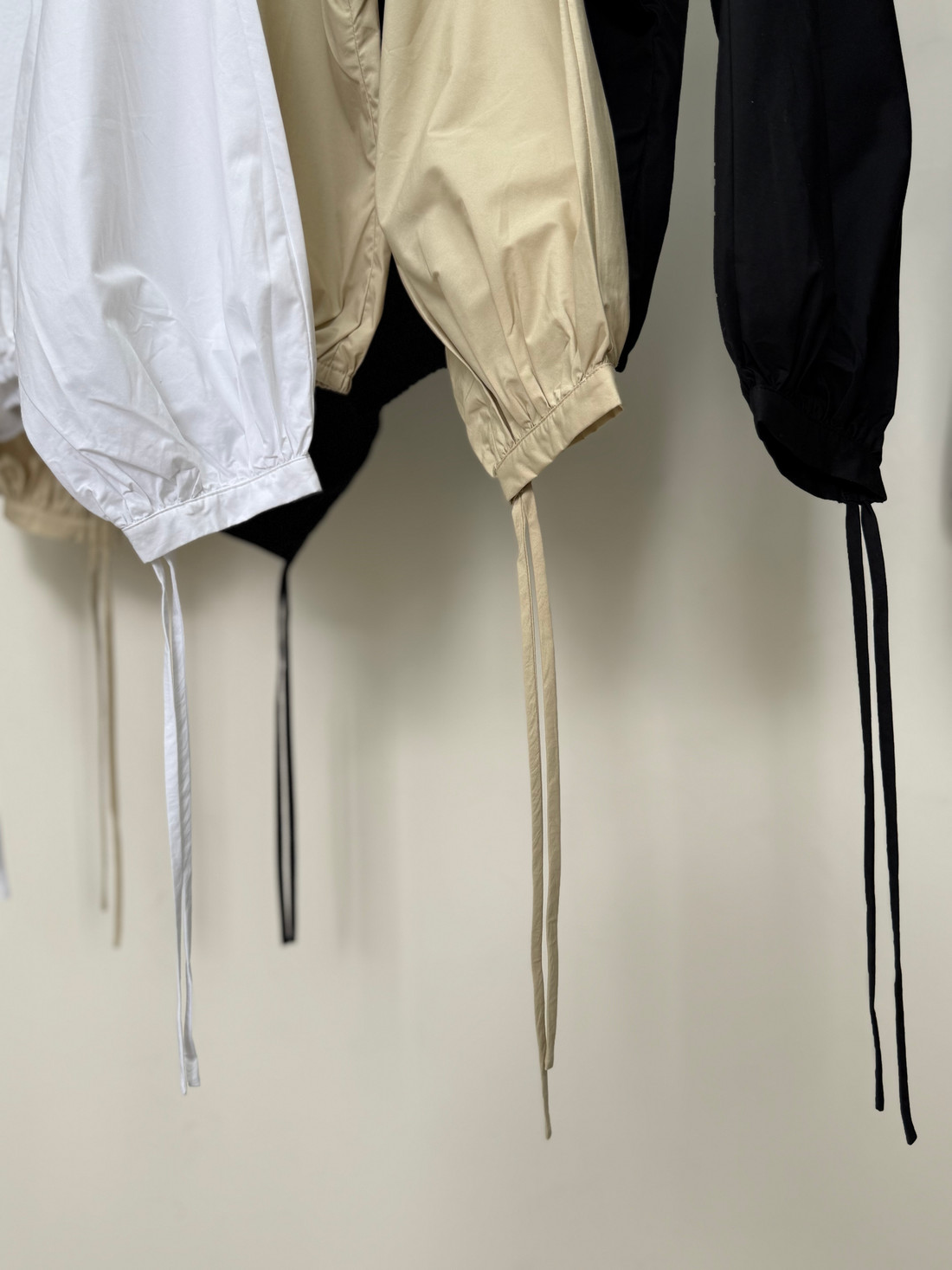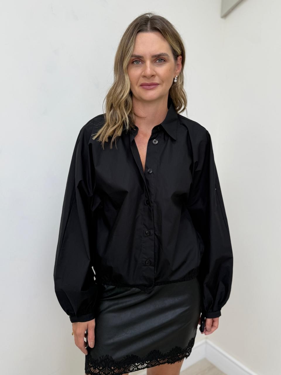 Camisa confeccionada em tricoline, tecido leve, macio e com estrutura. Possui gola clássica e fechamento frontal por botões aparentes. As mangas são longas, com volume levemente bufante e ajuste nos punhos por elástico, criando um efeito franzido delicado. A barra também conta com elástico embutido, proporcionando melhor ajuste ao corpo e um caimento mais moderno. Conta ainda com tiras alongadas nas laterais das mangas, que adicionam um detalhe diferenciado e contemporâneo à peça.