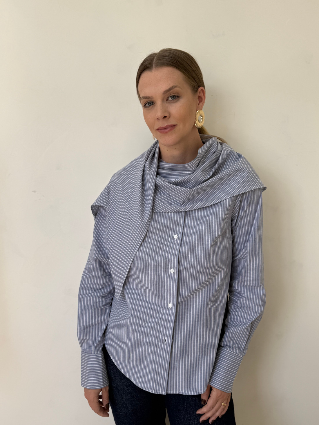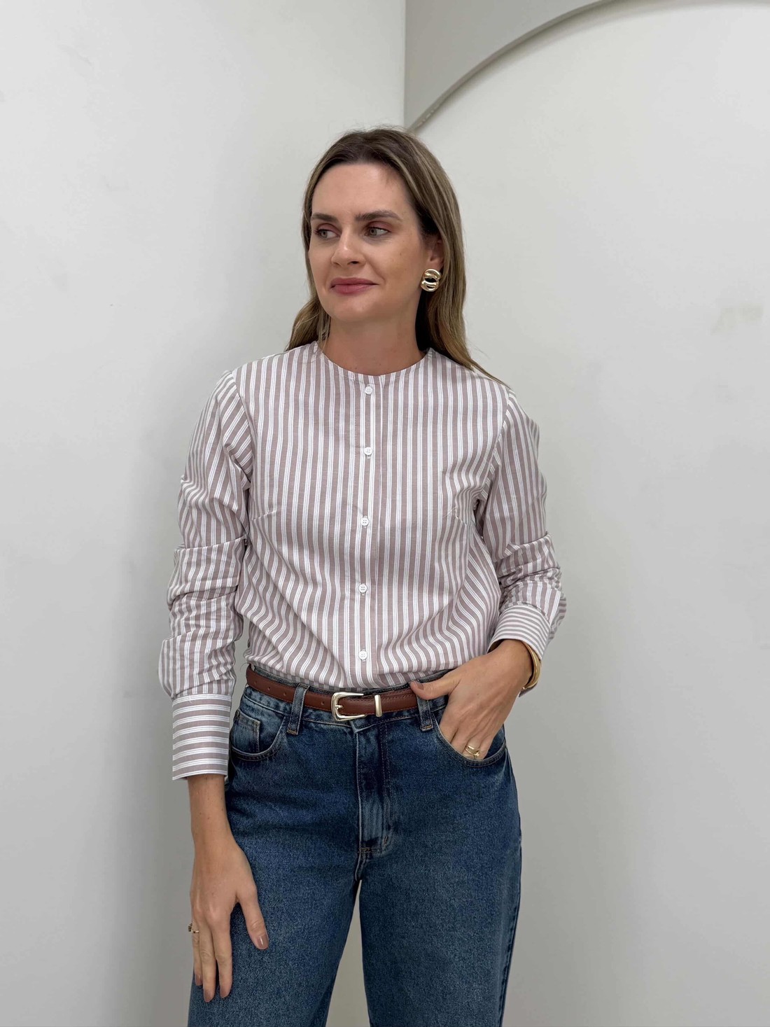 Confeccionada em tricoline camisaria risca, tecido leve e de toque macio com padronagem clássica que traduz elegância atemporal. Possui caimento alinhado e confortável, proporcionando um visual sofisticado e versátil. O modelo apresenta decote arredondado, fechamento frontal por botões, mangas longas com punho fechado por botão, pences no busto e barra fraldada, garantindo estrutura e acabamento refinado. Acompanha lenço avulso do mesmo tecido, que adiciona charme e possibilidades de styling. Elegante e atemporal, esta camisa combina sofisticação com leveza, trazendo modernidade e personalidade ao look. O design clássico ganha destaque com o lenço, permitindo composições que transitam naturalmente do office ao casual chic.