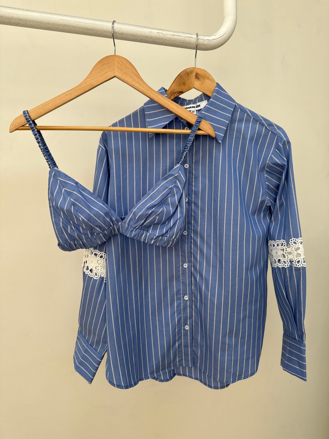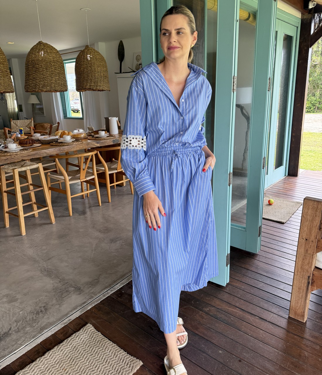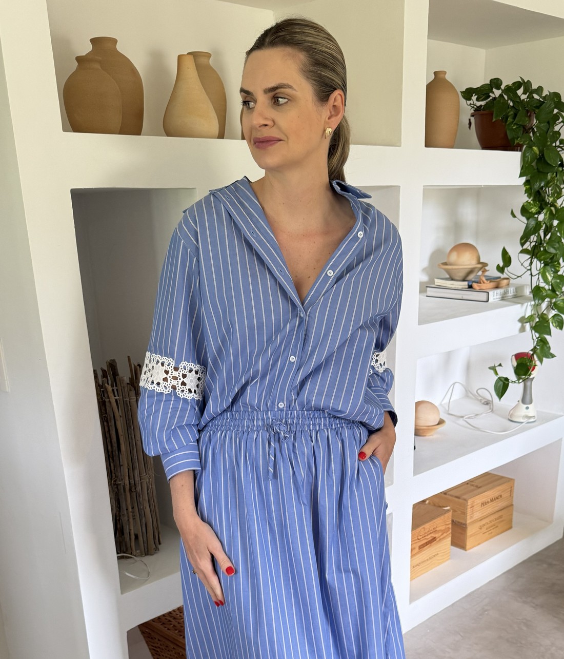 Confeccionado em tricoline de risca, a Camisa com Risca Naomi une a elegância do clássico com um toque moderno e artesanal. O tecido tem leve estrutura, toque suave e uma padronagem atemporal que alonga a silhueta e reforça o visual sofisticado. A camisa acompanha um top com elástico nas alças e na barra, garantindo conforto e ajuste perfeito ao corpo. A camisa tem gola francesa, com fechamento por botões, mangas longas com detalhe em renda e comprimento levemente alongado, criando uma silhueta equilibrada, leve e refinada.