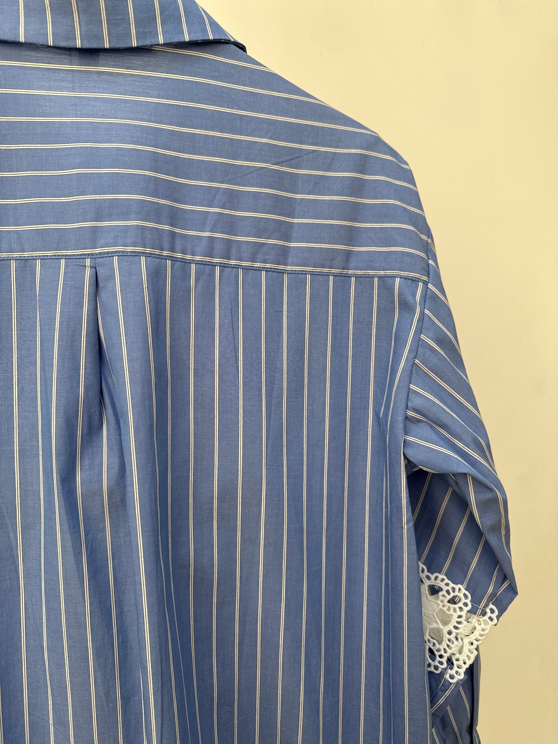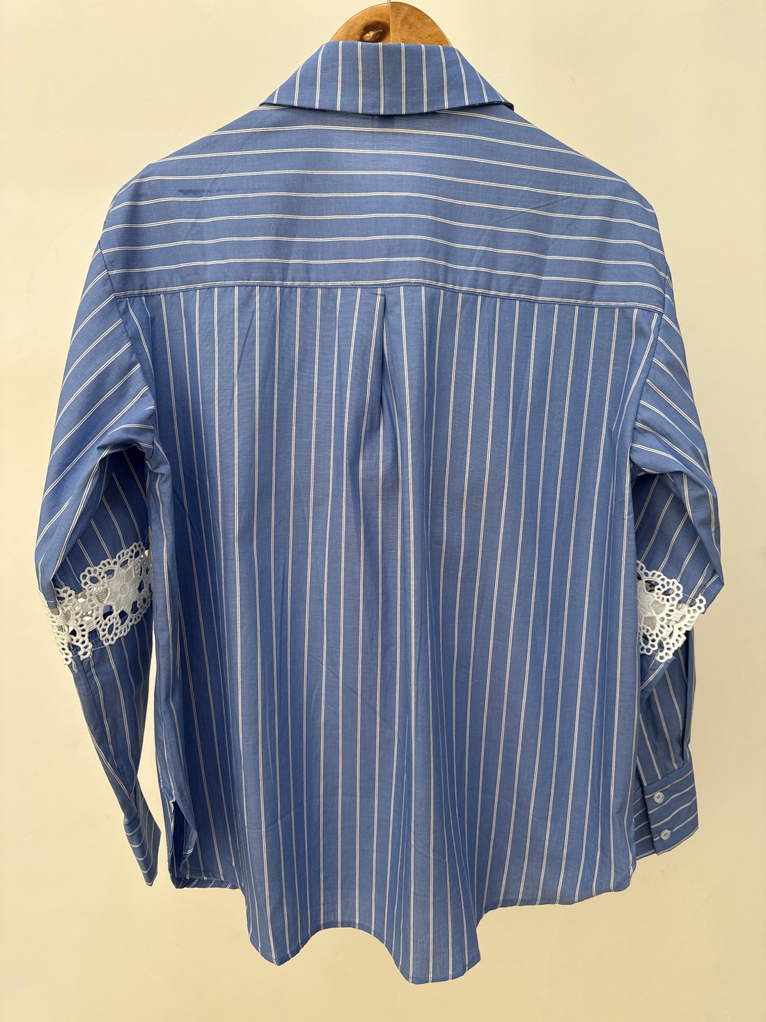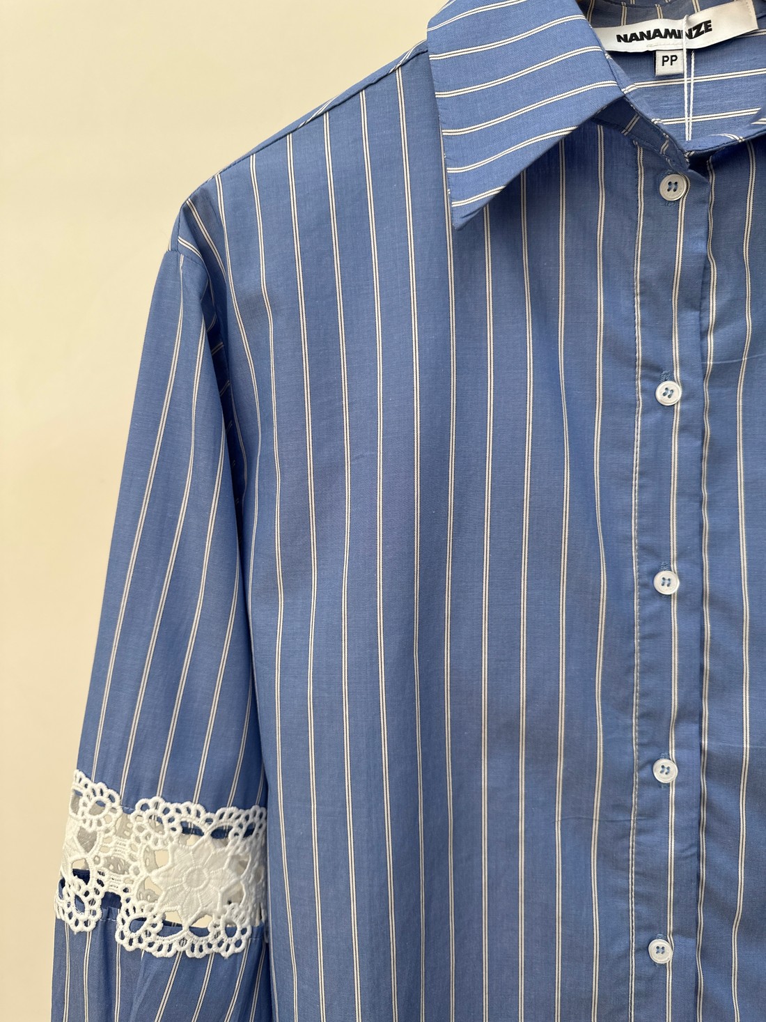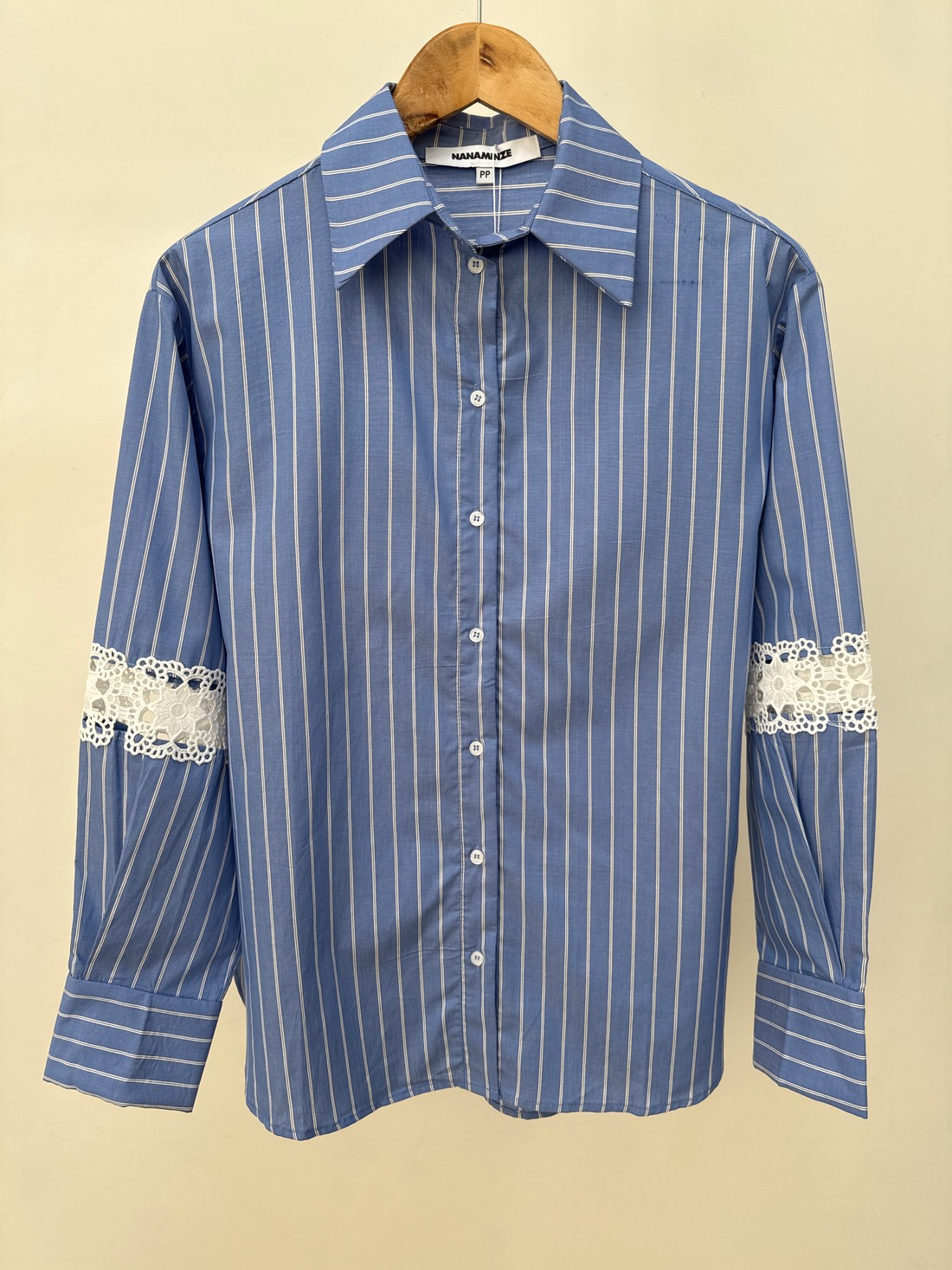 Confeccionado em tricoline de risca, a Camisa com Risca Naomi une a elegância do clássico com um toque moderno e artesanal. O tecido tem leve estrutura, toque suave e uma padronagem atemporal que alonga a silhueta e reforça o visual sofisticado. A camisa acompanha um top com elástico nas alças e na barra, garantindo conforto e ajuste perfeito ao corpo. A camisa tem gola francesa, com fechamento por botões, mangas longas com detalhe em renda e comprimento levemente alongado, criando uma silhueta equilibrada, leve e refinada.