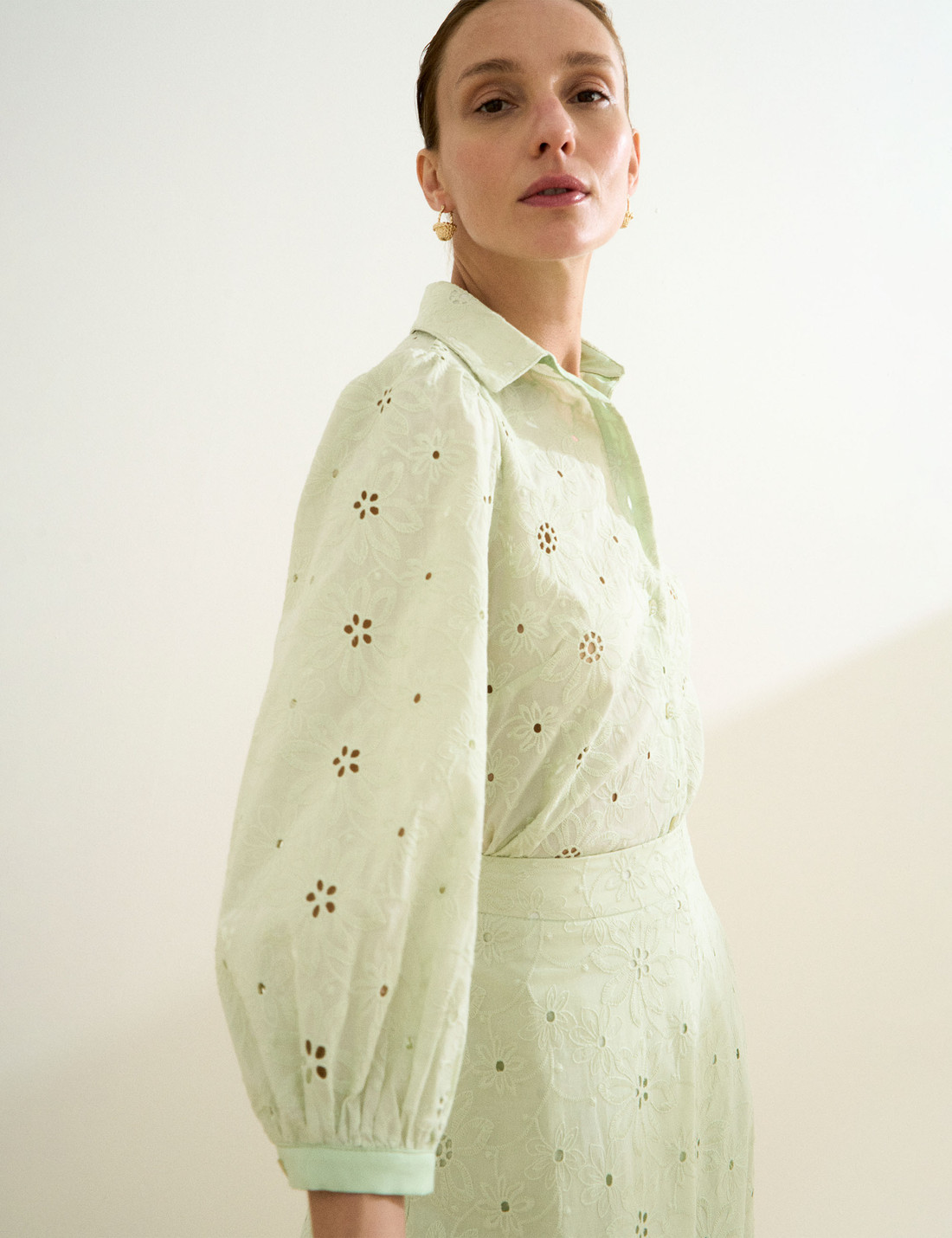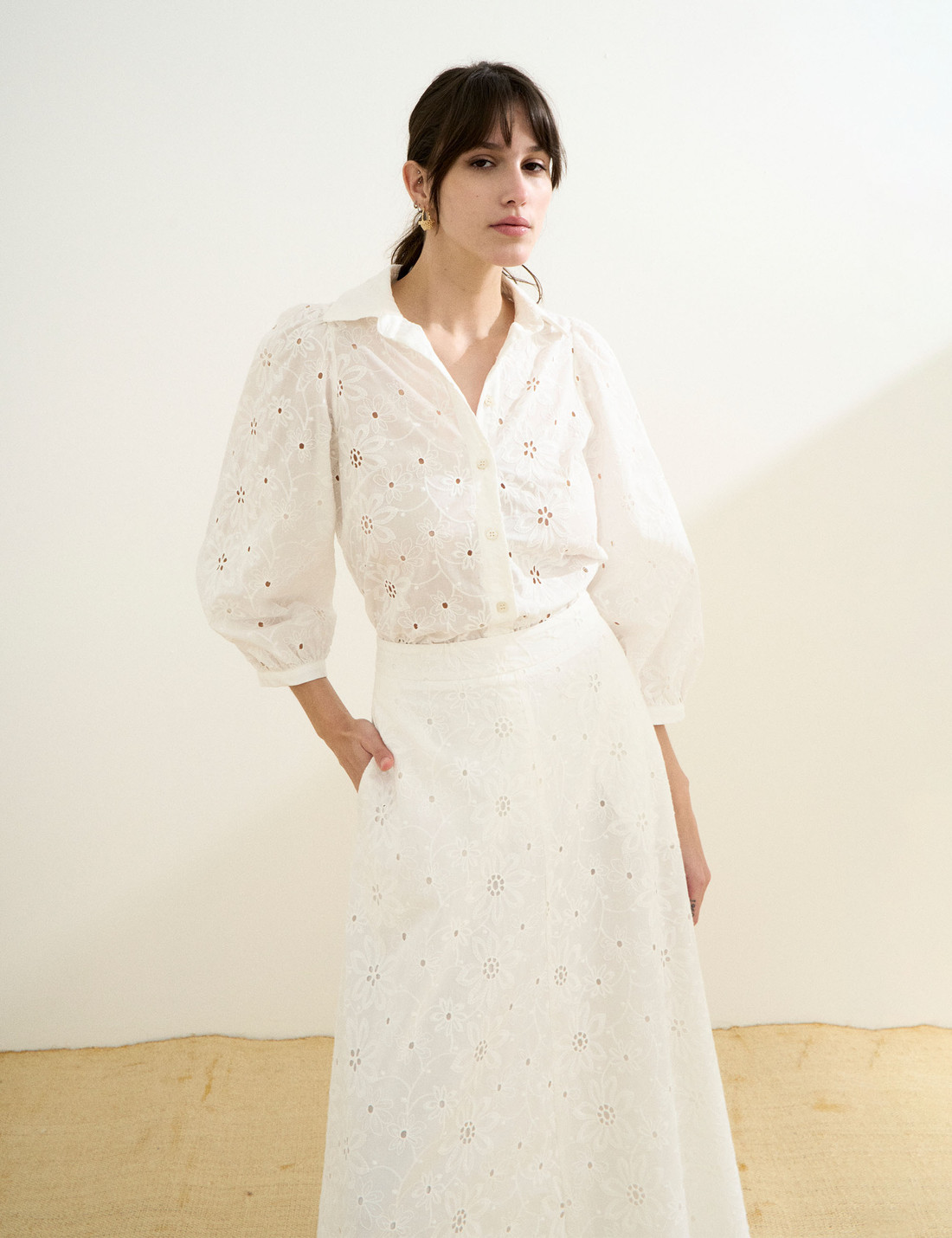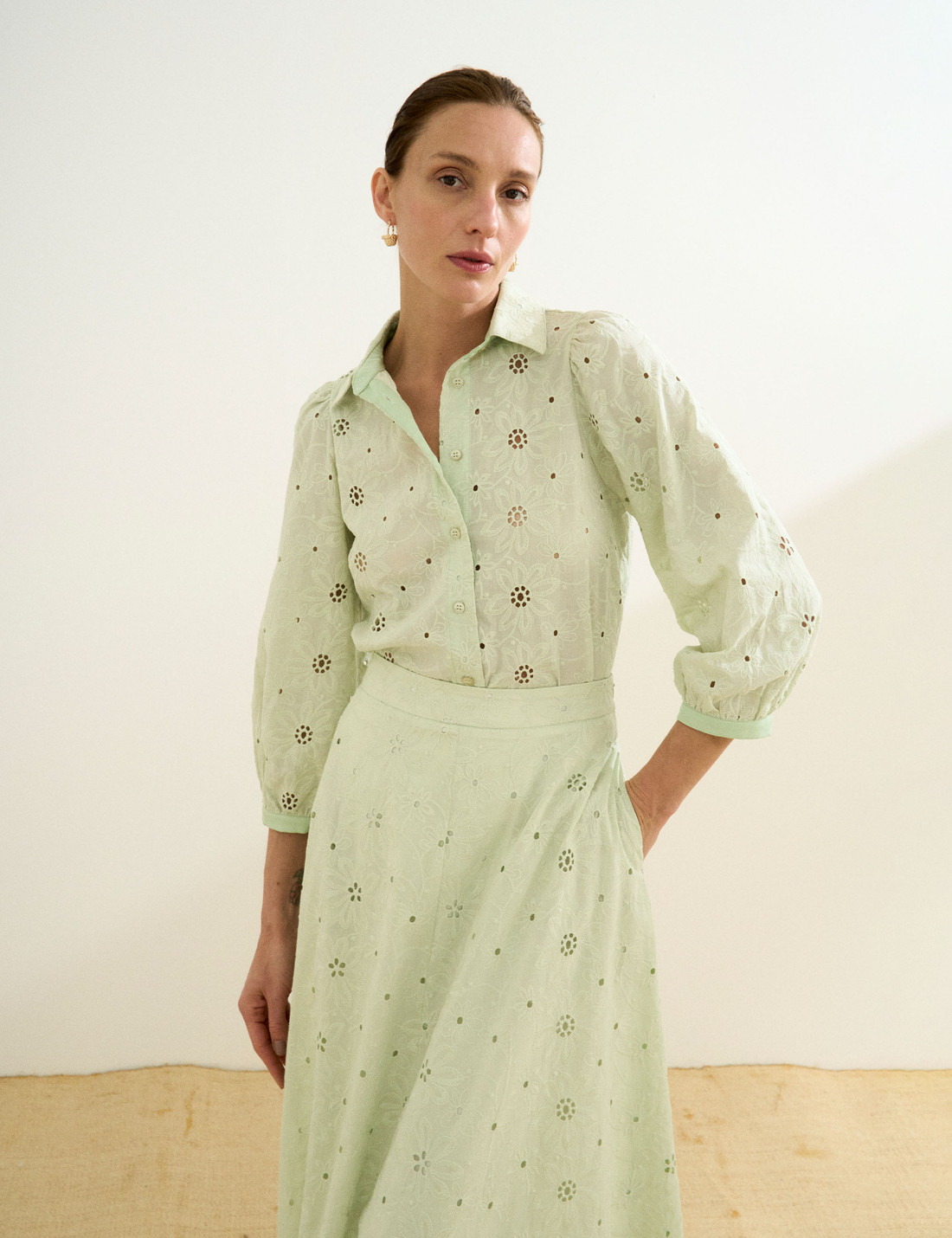Confeccionada em laise, a Camisa Leslie possui tecido leve com bordado floral e pequenos recortes vazados, unindo modernidade, delicadeza e elegância em um só modelo. A camisa possui gola francesa clássica, fechamento frontal por botões e mangas 7/8 levemente bufantes, finalizadas com botão no punho, que acrescentam um toque feminino e sofisticado à silhueta. A modelagem é solta e fluida, com fendas laterais que proporcionam movimento e leveza ao vestir. Com detalhes trabalhados e um caimento suave, é uma peça versátil, perfeita para composições frescas e descontraídas, sem abrir mão do charme e da sofisticação natural.