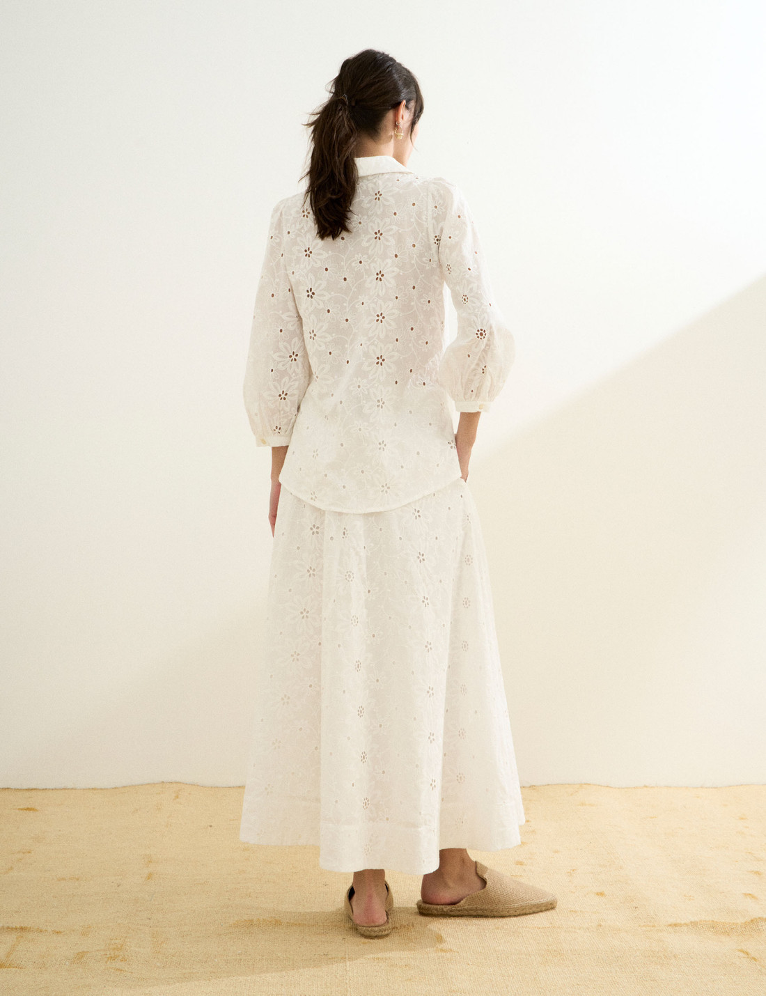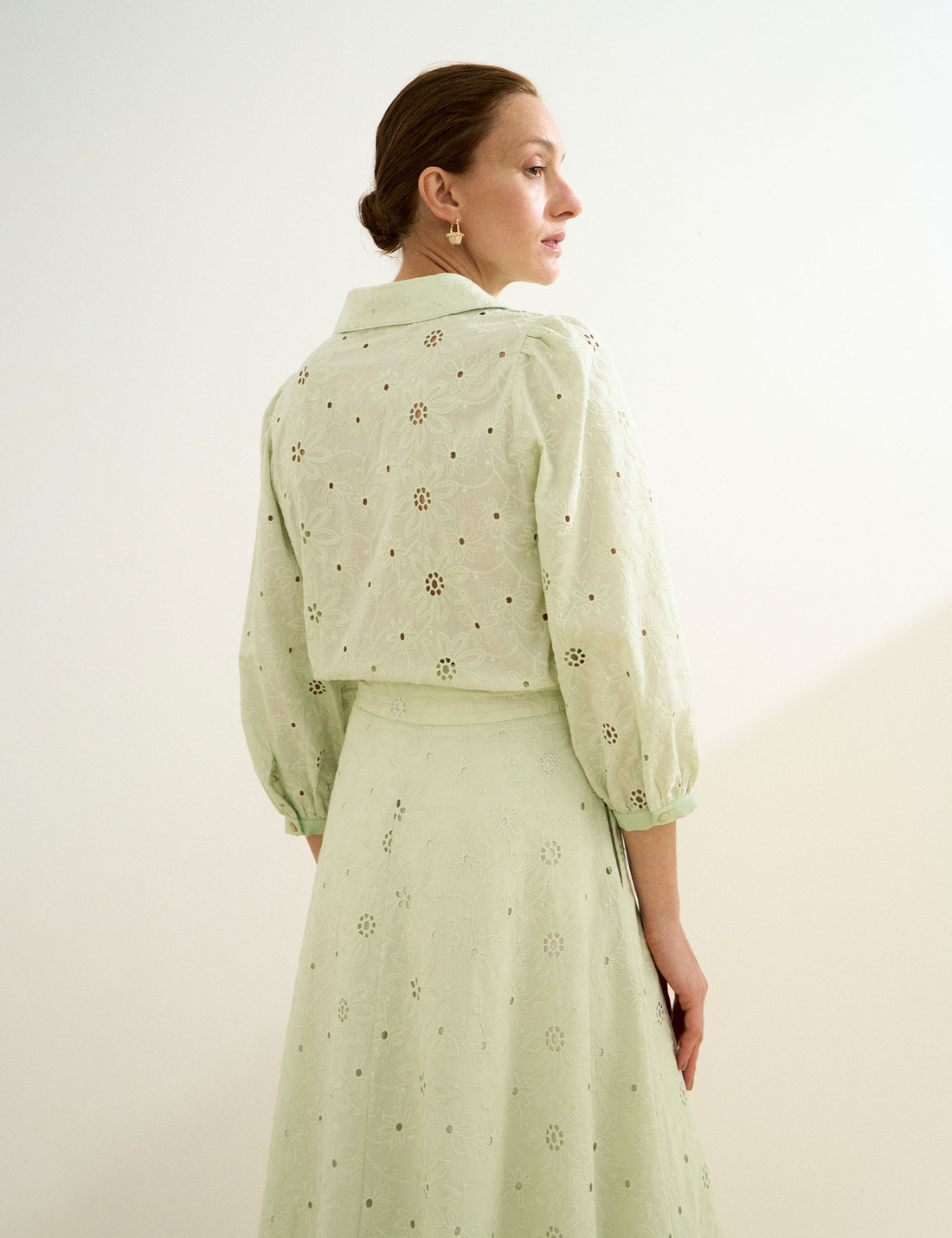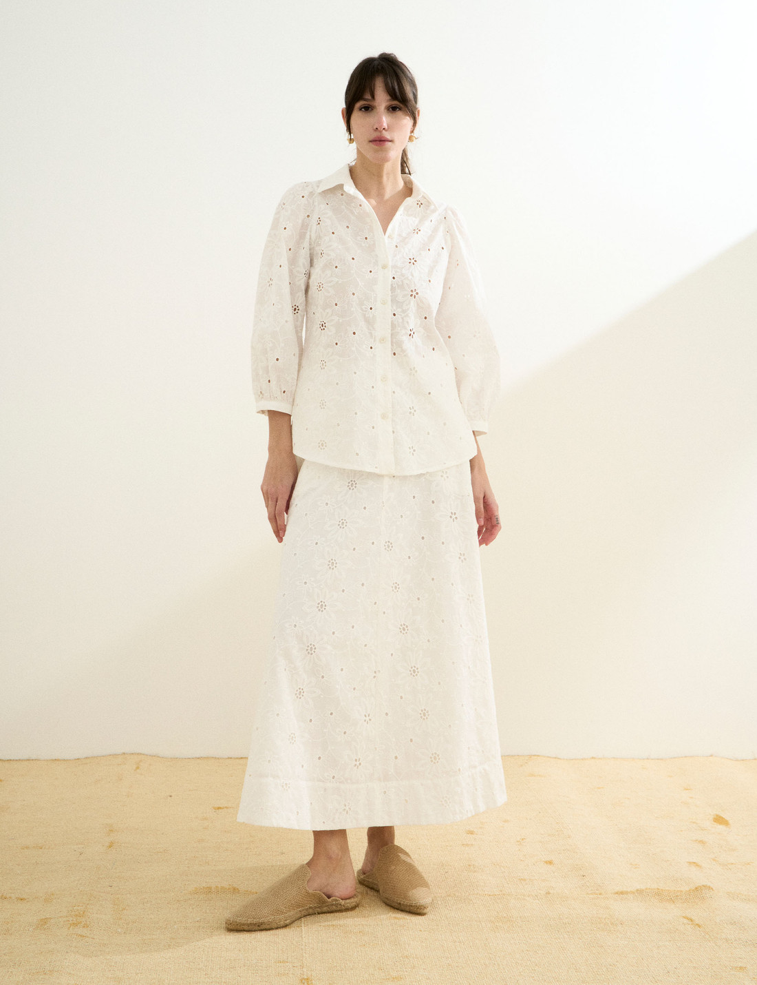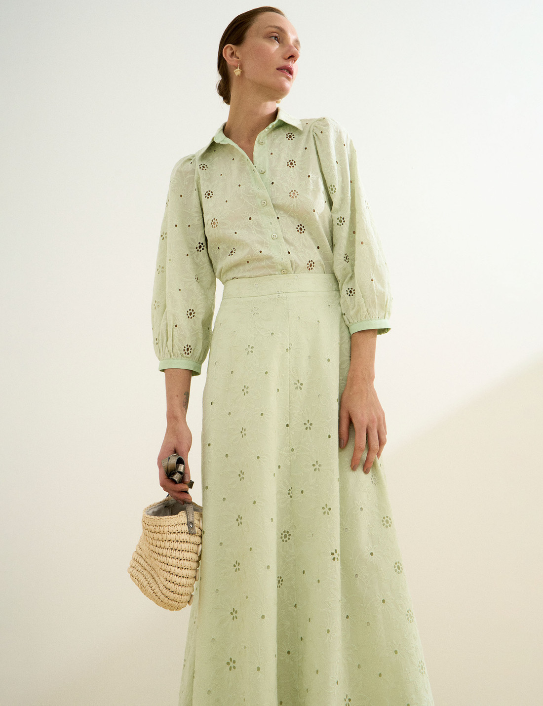 Confeccionada em laise, a Camisa Leslie possui tecido leve com bordado floral e pequenos recortes vazados, unindo modernidade, delicadeza e elegância em um só modelo. A camisa possui gola francesa clássica, fechamento frontal por botões e mangas 7/8 levemente bufantes, finalizadas com botão no punho, que acrescentam um toque feminino e sofisticado à silhueta. A modelagem é solta e fluida, com fendas laterais que proporcionam movimento e leveza ao vestir. Com detalhes trabalhados e um caimento suave, é uma peça versátil, perfeita para composições frescas e descontraídas, sem abrir mão do charme e da sofisticação natural.