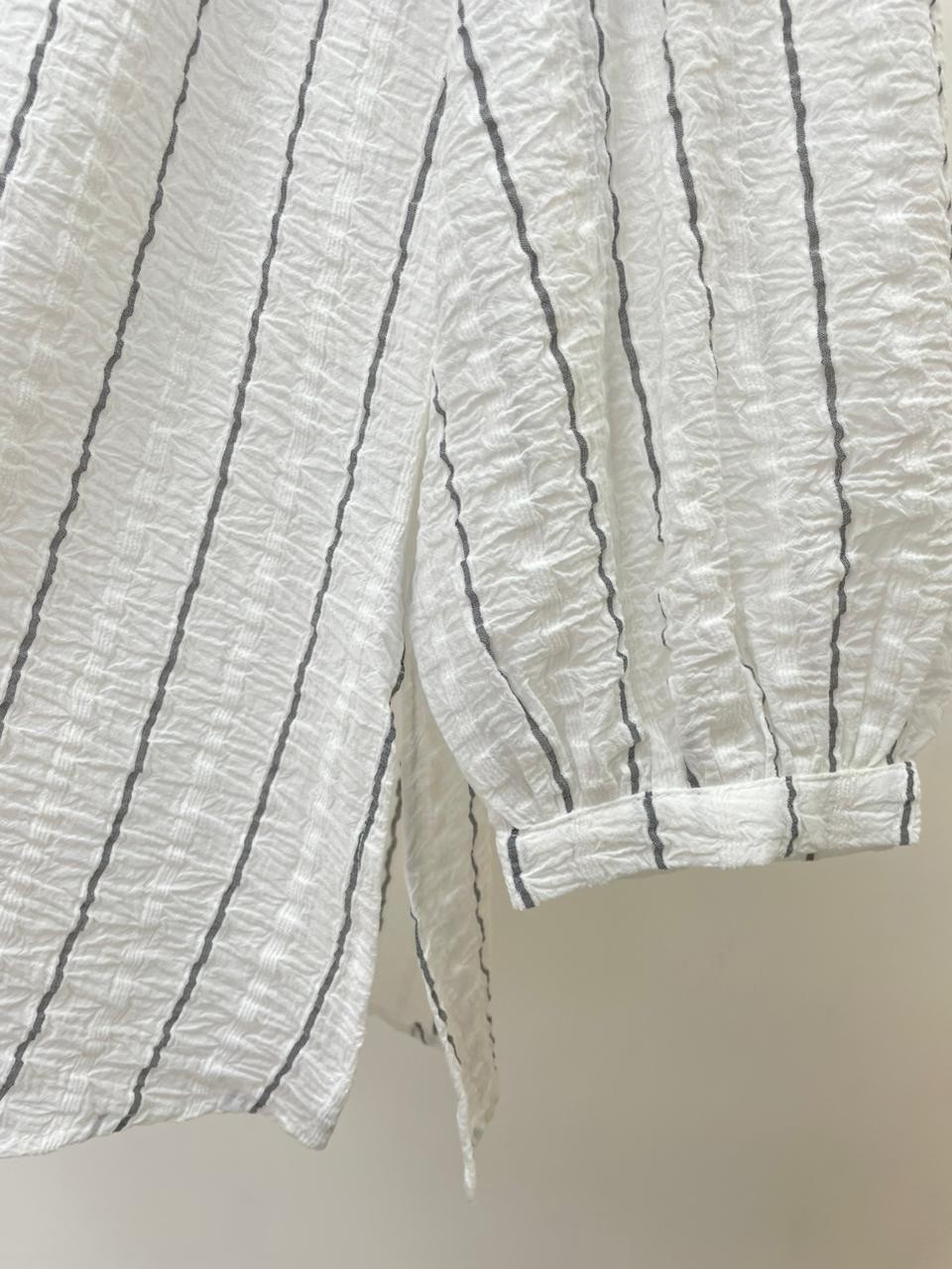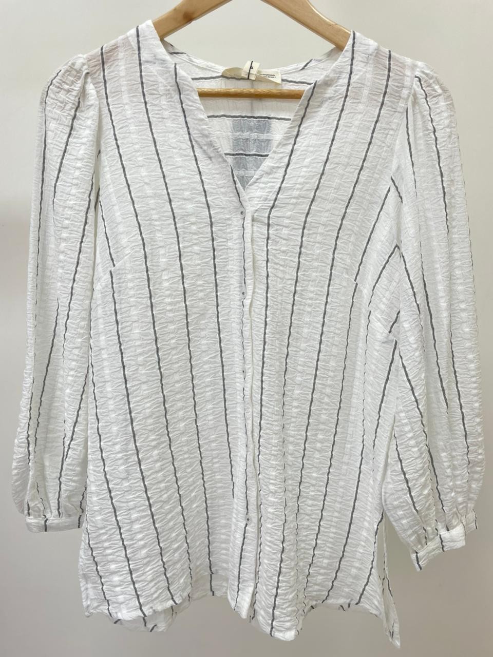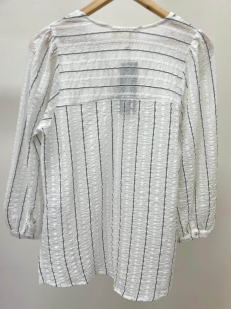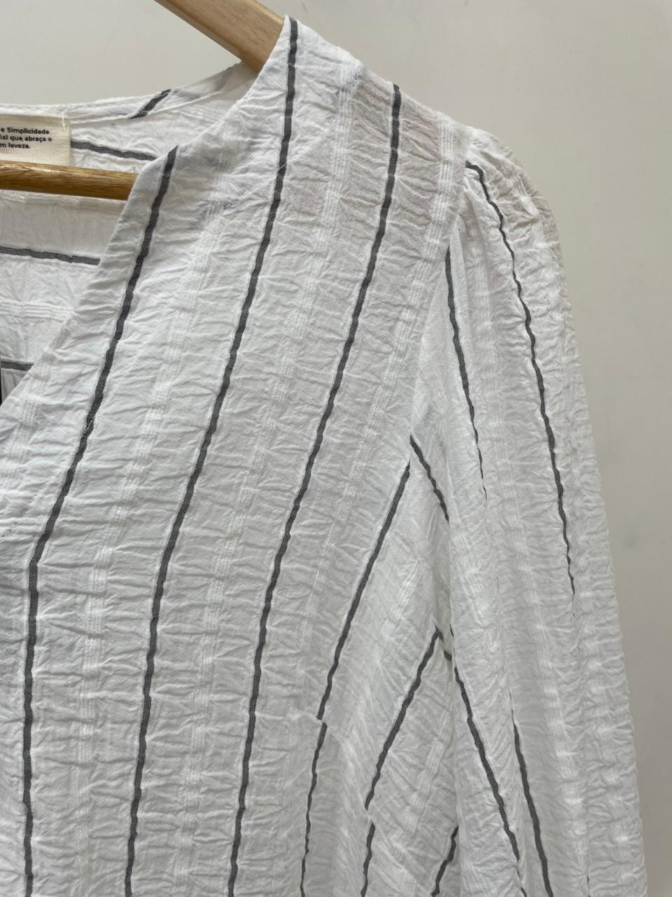 Confeccionada em tecido misto de algodão com viscose, a Camisa Mykonos une leveza, conforto e um toque de sofisticação. Com textura suave e padronagem de listras discretas, ela traz modernidade na medida certa, adicionando personalidade sem perder a delicadeza. O fechamento frontal por botões e as mangas 7/8 com abotoamento no punho garantem um visual elegante e atemporal. A pence no busto proporciona um ajuste sutil ao corpo, valorizando a silhueta com naturalidade. Já a fenda lateral de 17 cm confere leveza ao movimento, completando o design com charme e fluidez. Com um equilíbrio perfeito entre feminilidade e modernidade, essa peça é ideal para composições versáteis — do office look ao final de semana descomplicado.