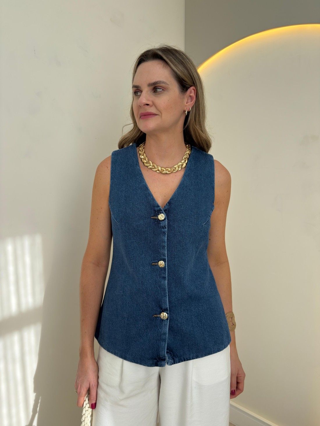 O colete jeans Larissa é a peça coringa que o seu guarda-roupa precisa. Seu design clássico e atemporal traz um decote em V , que alonga a silhueta e permite criar sobreposições modernas e cheias de estilo. O fechamento frontal com botões dourados adiciona um toque elegante e sofisticado, contrastando com o visual casual do jeans. Confeccionado em jeans 100% Algodão, sua modelagem reta e levemente solta proporciona liberdade de movimentos.