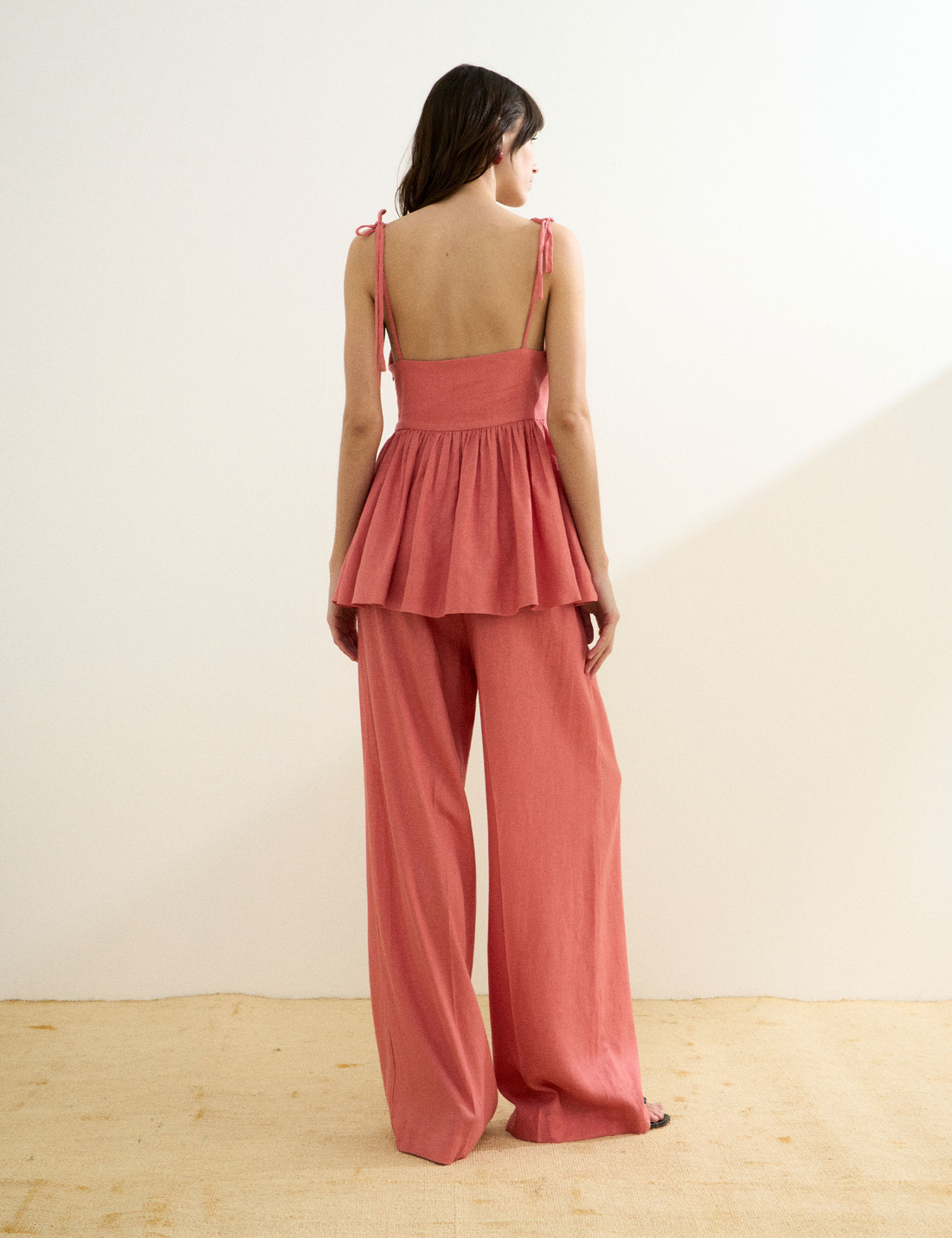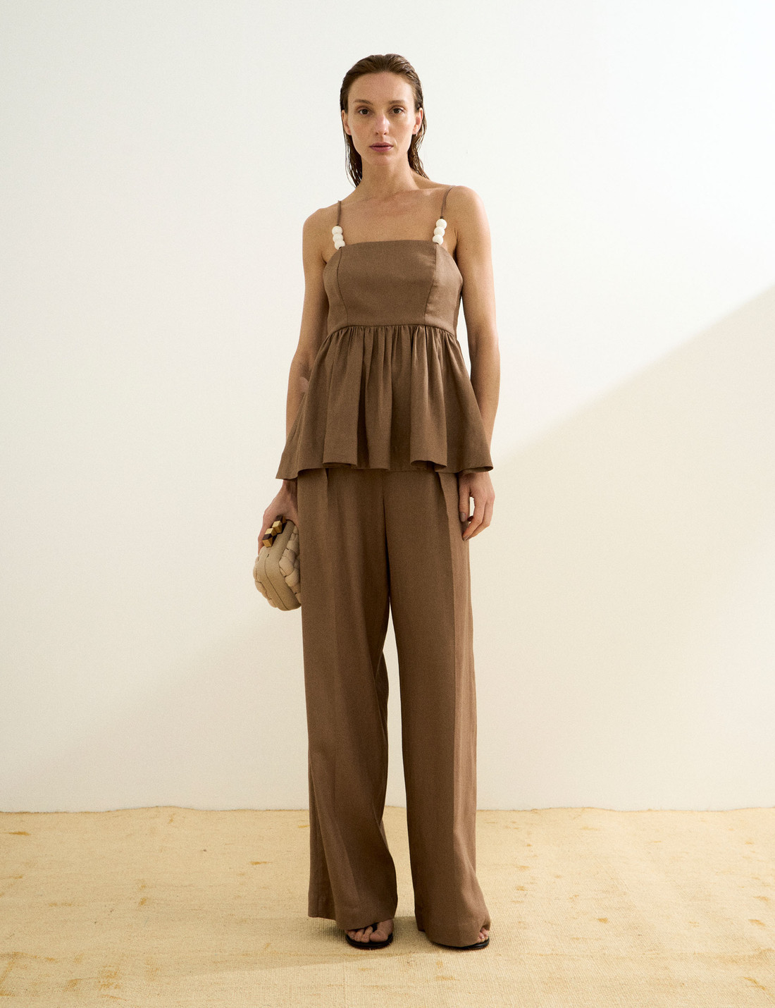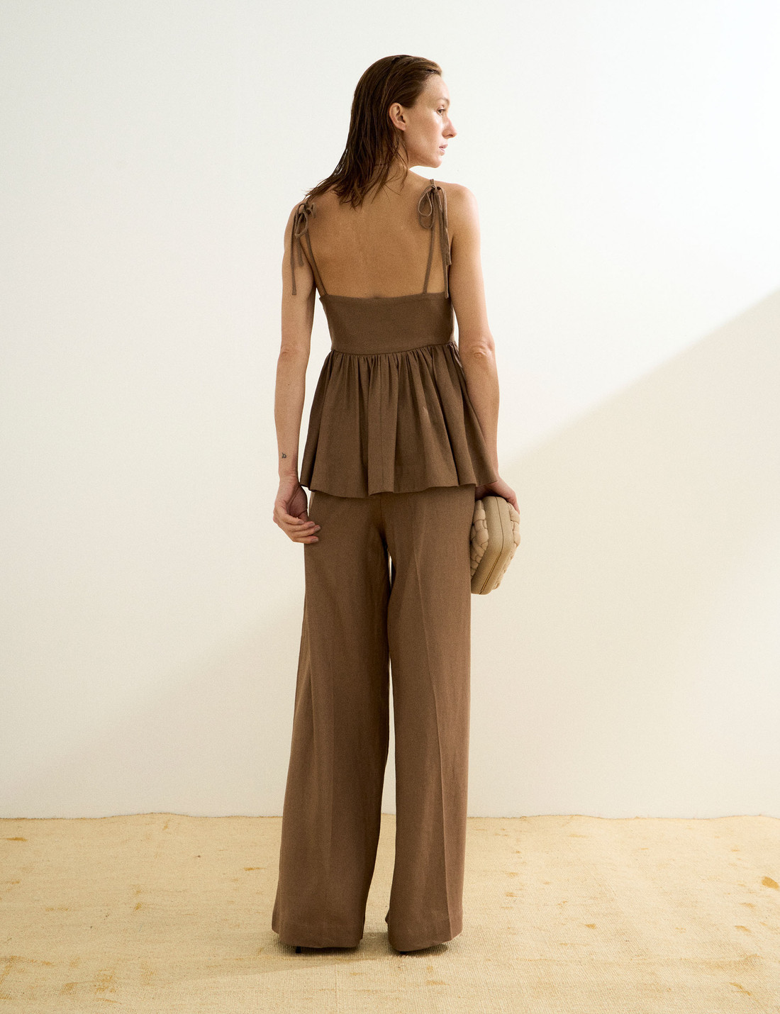 O Conjunto de Peplum Babi é confeccionado em linho macio, um tecido fresco, respirável e com leve textura que confere um toque rústico-chique à produção. A blusa apresenta decote reto com alças para amarração nos ombros e ponteiras frontais, modelagem ajustada ao busto e recorte peplum que adiciona leveza e feminilidade ao visual. A calça possui cintura com elástico para maior conforto, zíper lateral invisível, pregas frontais e forro embutido, garantindo caimento impecável. Sua modelagem ampla proporciona movimento e elegância, equilibrando perfeitamente com a silhueta marcada da blusa.