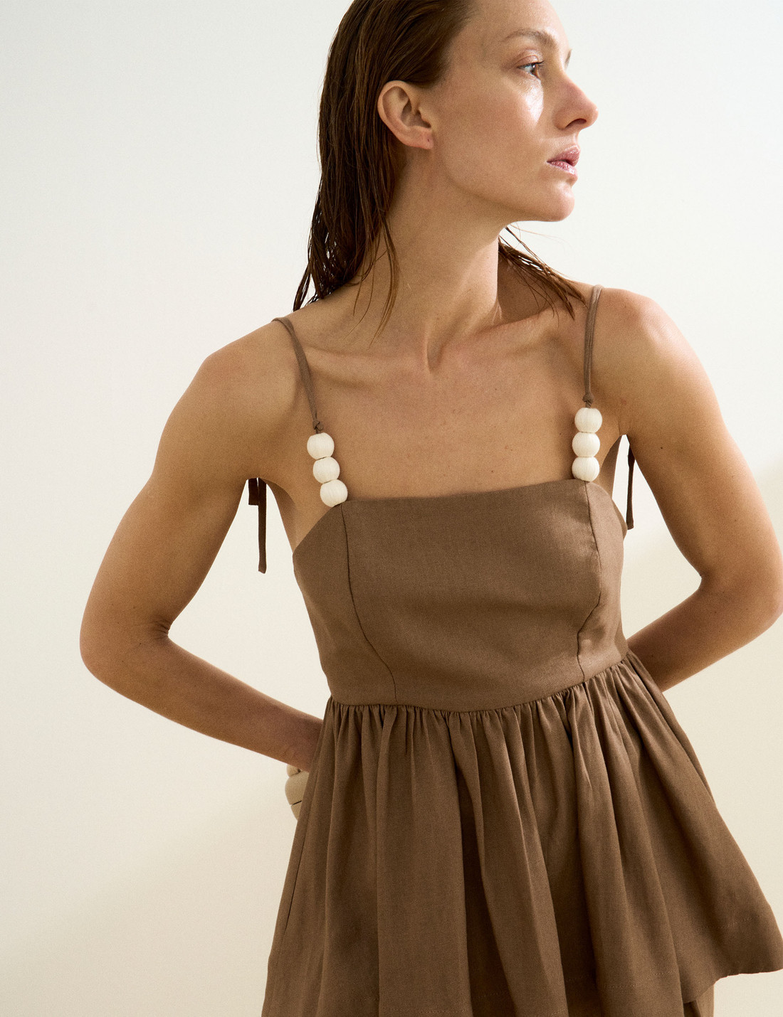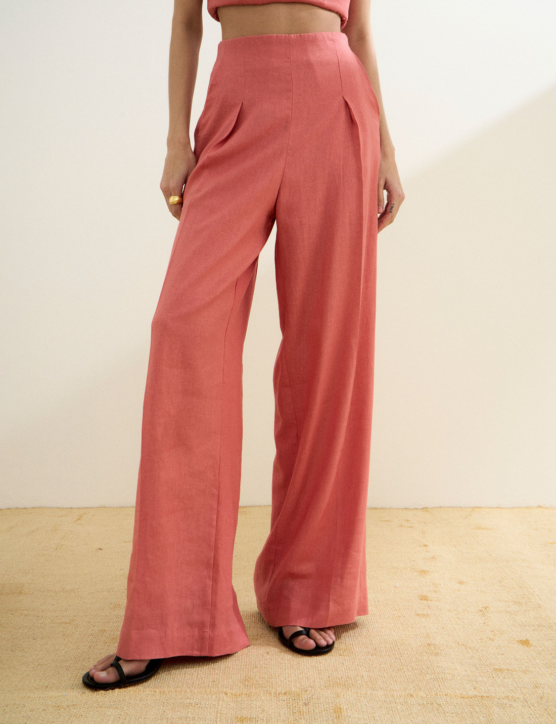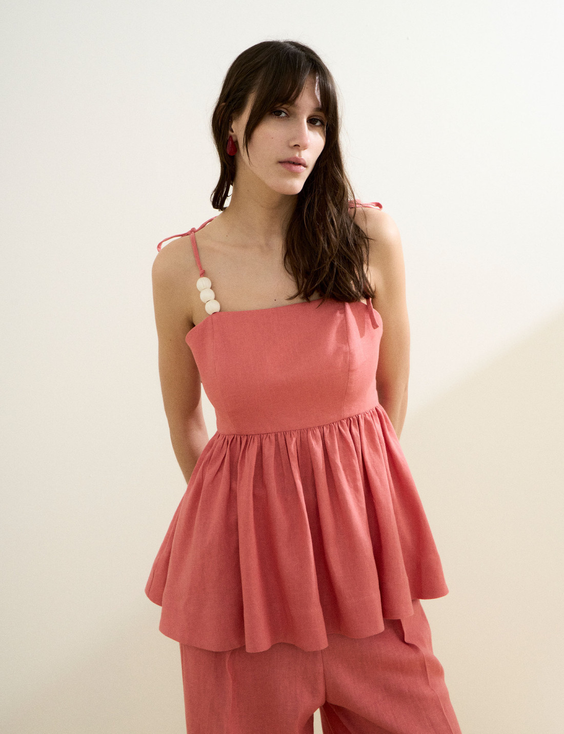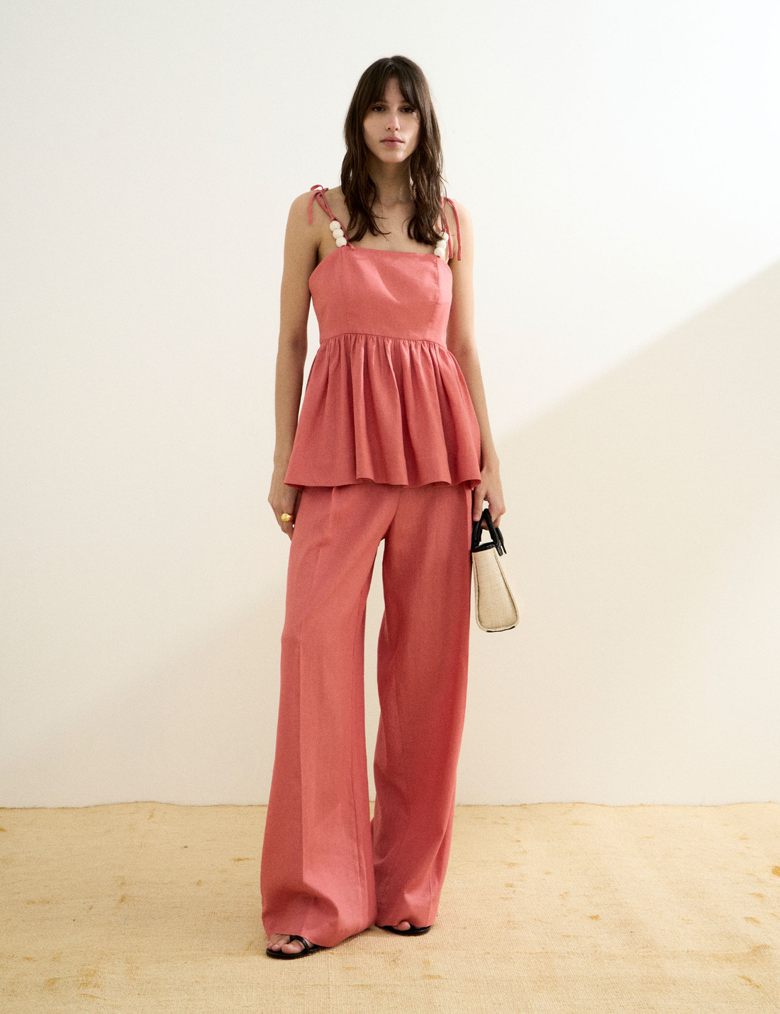 O Conjunto de Peplum Babi é confeccionado em linho macio, um tecido fresco, respirável e com leve textura que confere um toque rústico-chique à produção. A blusa apresenta decote reto com alças para amarração nos ombros e ponteiras frontais, modelagem ajustada ao busto e recorte peplum que adiciona leveza e feminilidade ao visual. A calça possui cintura com elástico para maior conforto, zíper lateral invisível, pregas frontais e forro embutido, garantindo caimento impecável. Sua modelagem ampla proporciona movimento e elegância, equilibrando perfeitamente com a silhueta marcada da blusa.