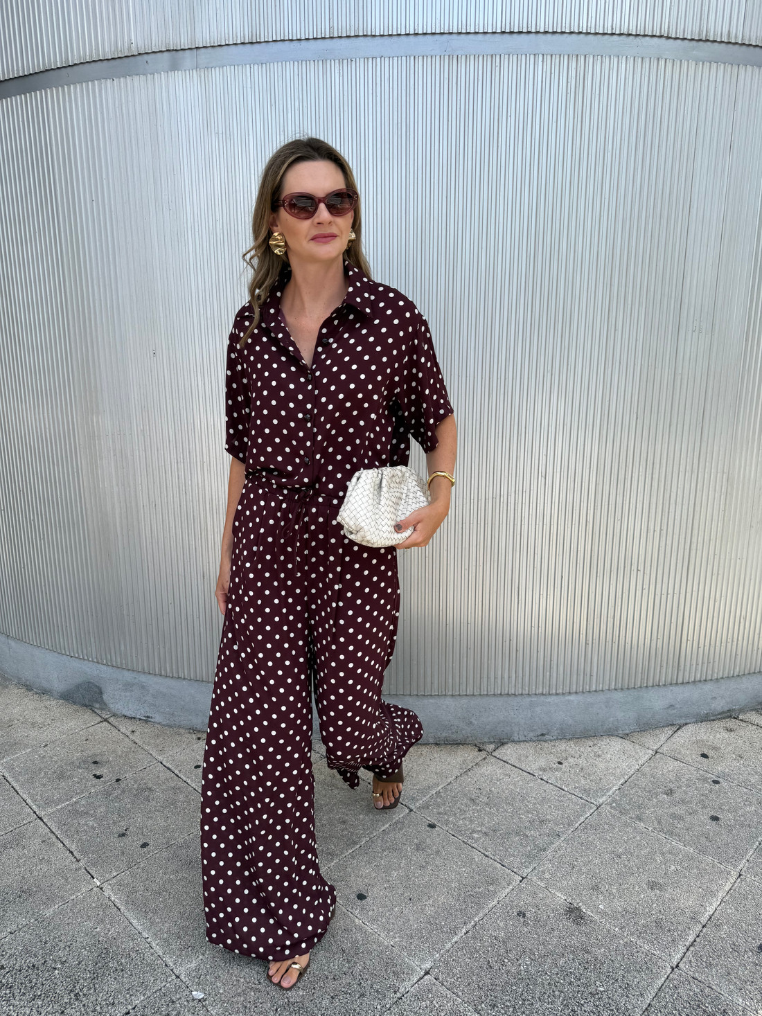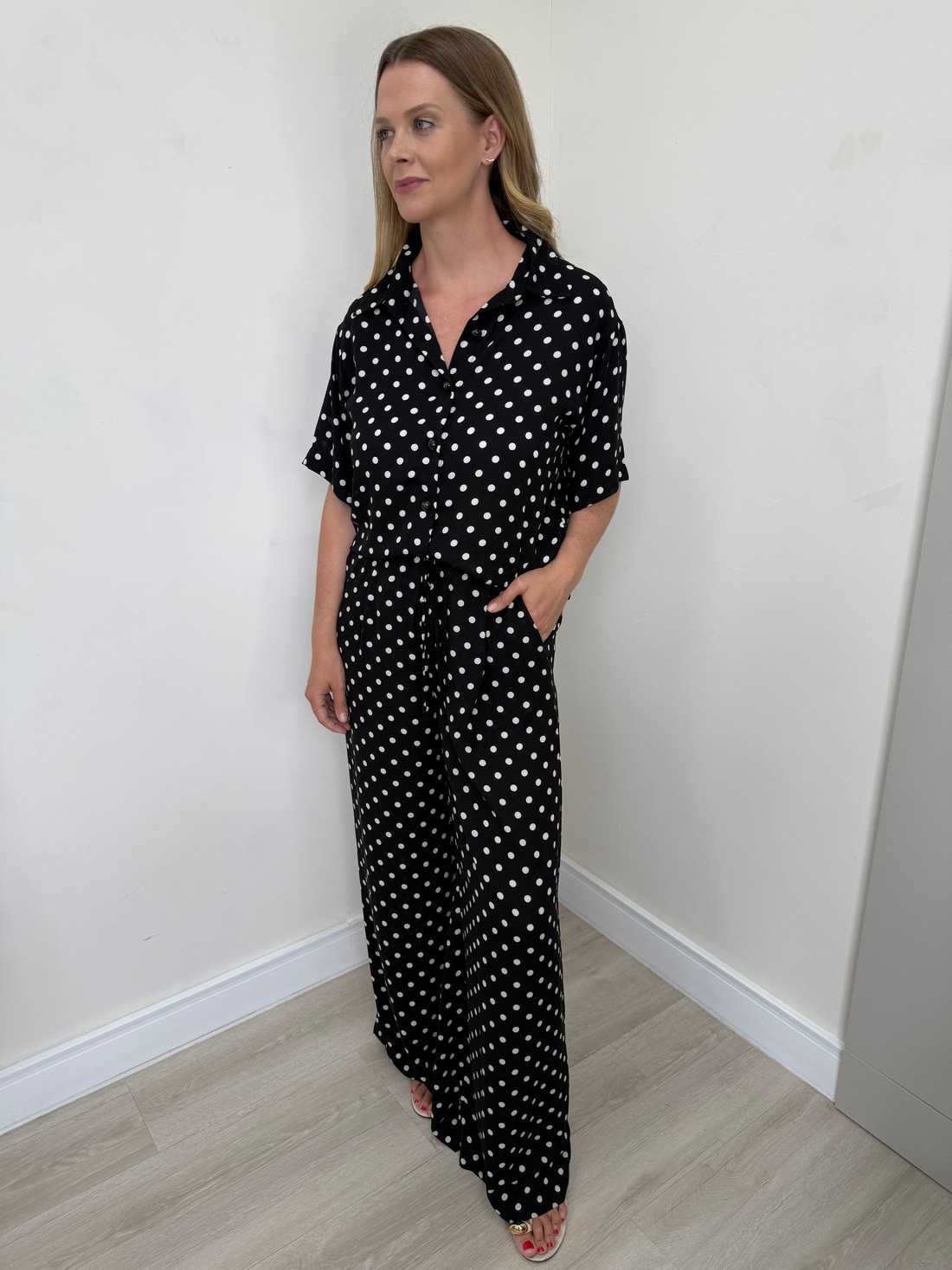 Confeccionado em crepe poá texturizado, o Conjunto de Poá Sofia apresenta tecido de toque leve e delicado, com padronagem charmosa que garante fluidez e um caimento elegante. A camisa de mangas curtas possui gola francesa, fechamento frontal por botões e modelagem ampla, proporcionando conforto e movimento. A calça conta com elástico na cintura e roletê para melhor ajuste, além de bolsos laterais, pregas frontais, detalhe de vista frontal e pences nas costas, que valorizam a silhueta. Com visual leve e moderno, o conjunto é ideal para compor produções casuais-chiques e versáteis.