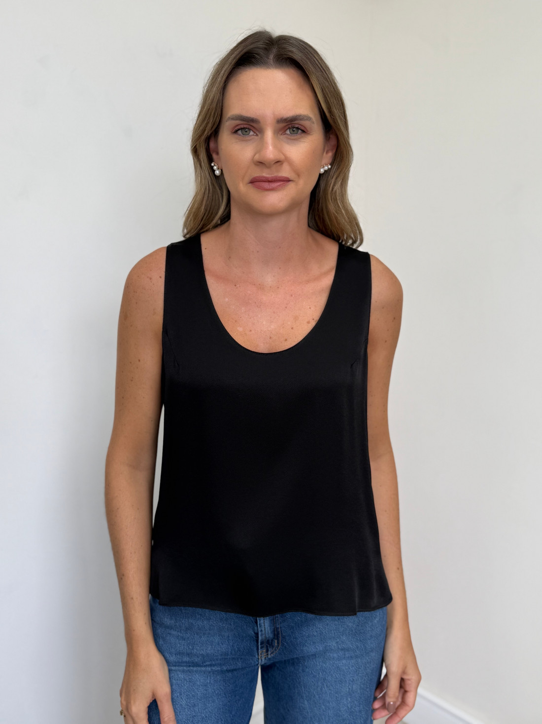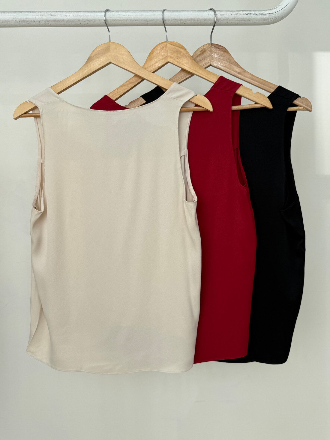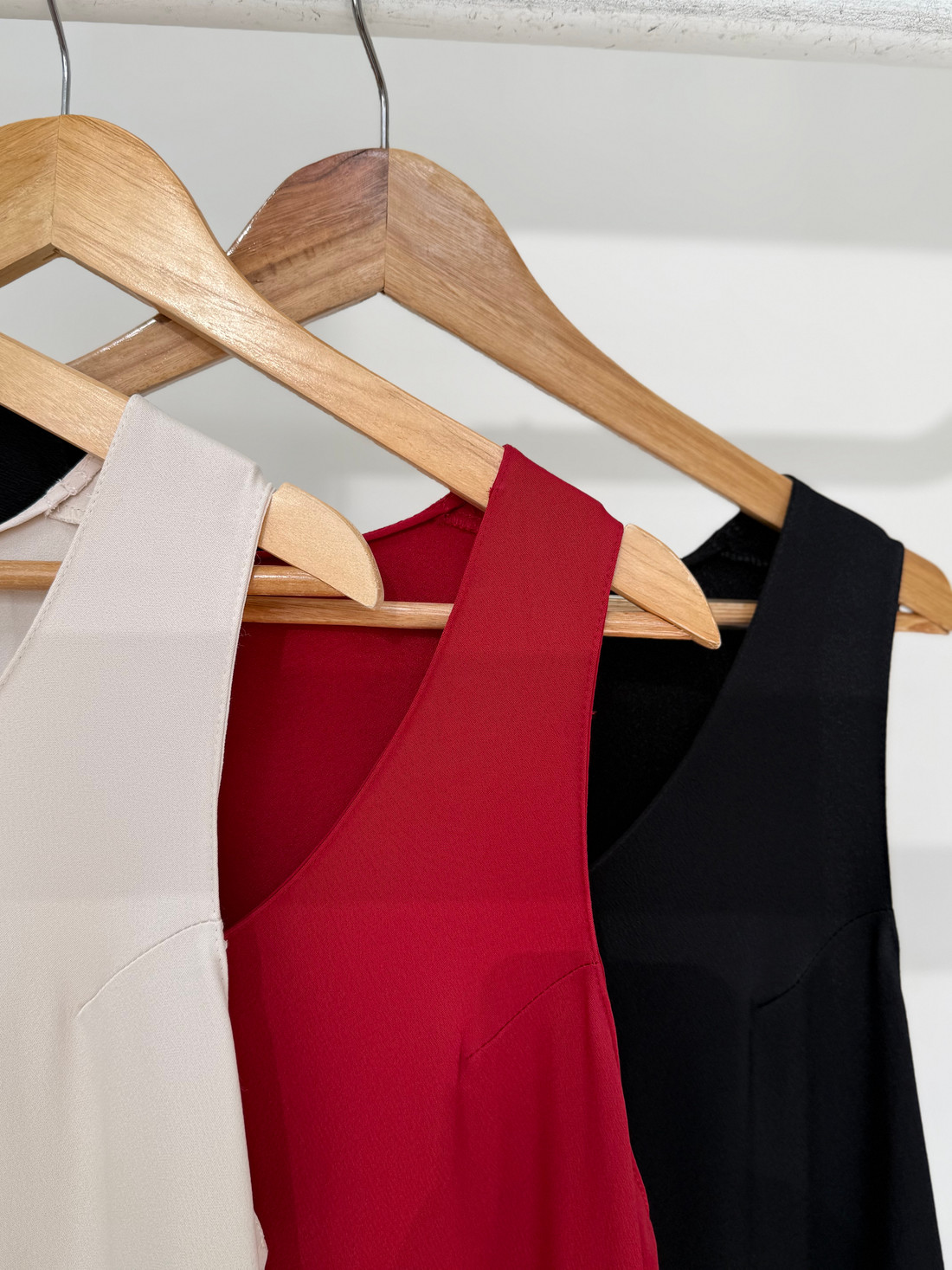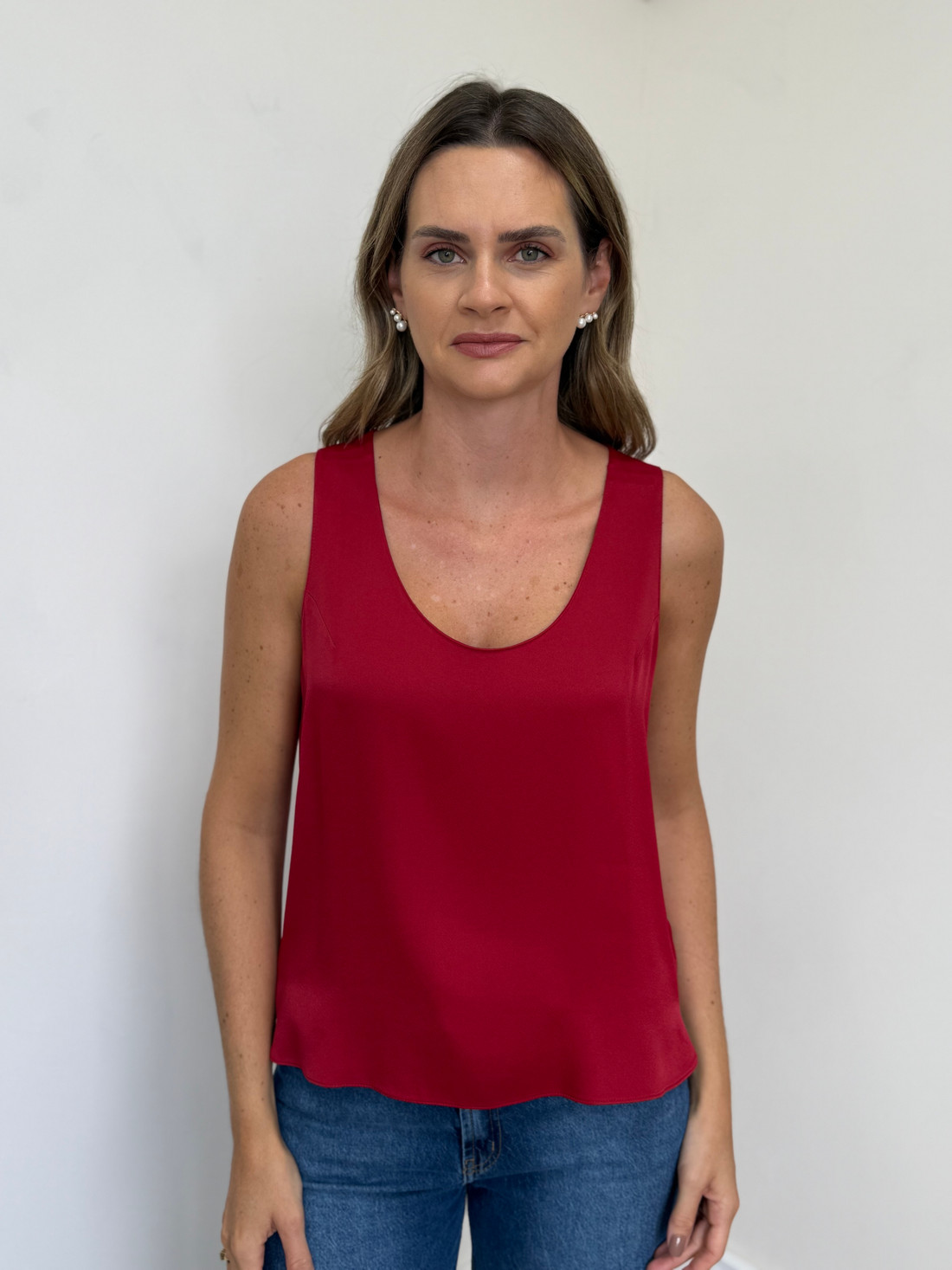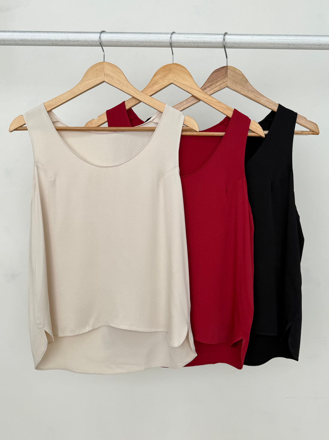 Blusa confeccionada em viscose, tecido leve e respirável que proporciona um toque macio e um caimento fluido impecável. O modelo apresenta design minimalista e atemporal, com decote arredondado que valoriza o colo de forma delicada e alças largas que garantem conforto e segurança ao vestir. Sua modelagem é soltinha ao corpo, criando movimento suave e elegante, ideal para composições que vão do casual ao sofisticado com facilidade. A barra levemente arredondada e com acabamento fluido traz um charme extra à peça, permitindo uso tanto por dentro quanto por fora da parte de baixo.