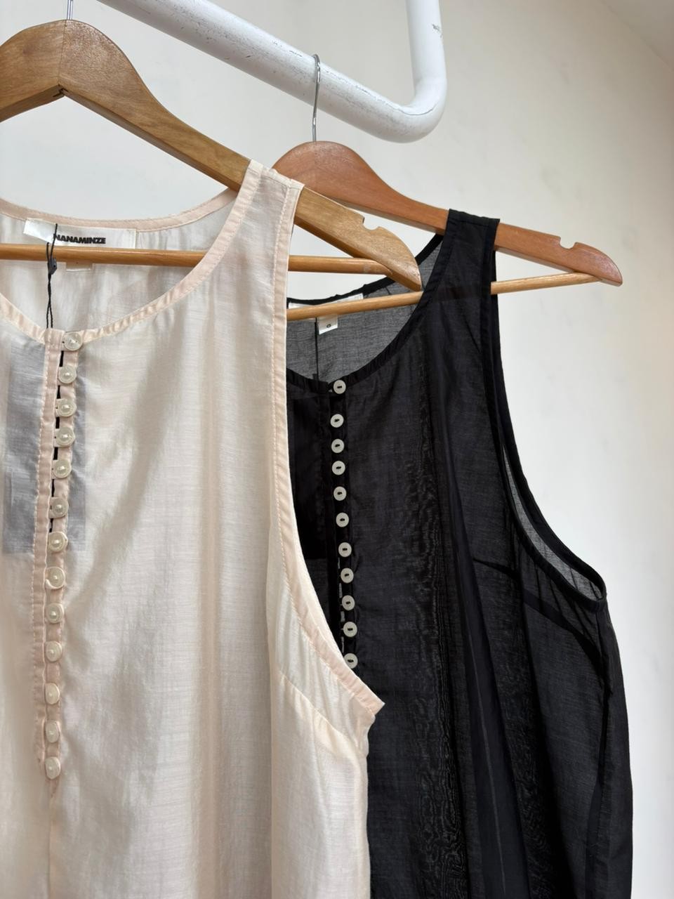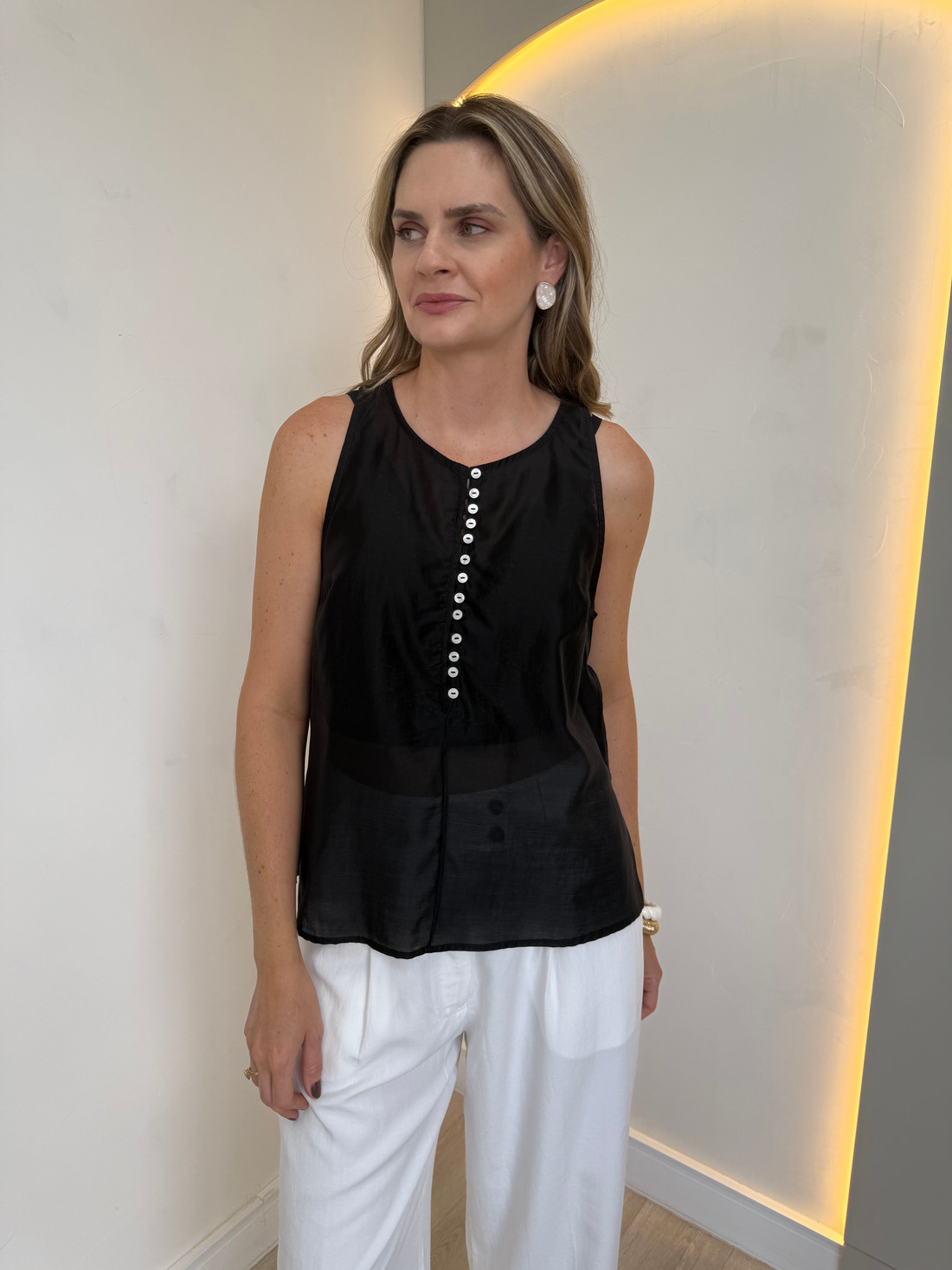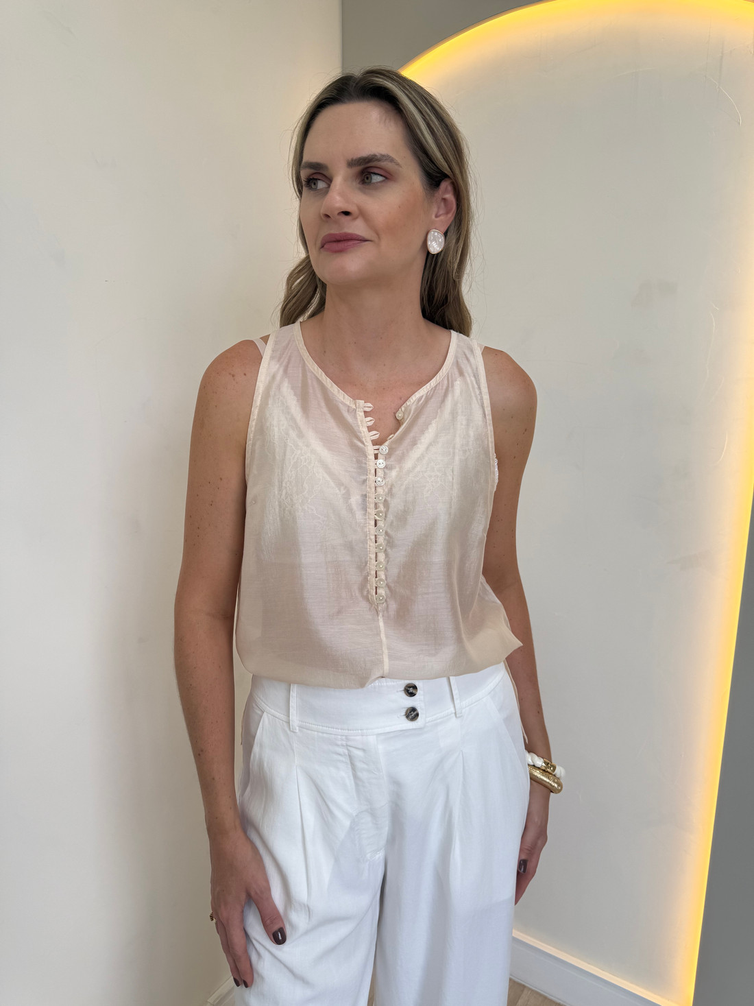 A Regata Viviane é a tradução do chic minimalista com um toque moderno e sofisticado. Confeccionada em liocel com toque de seda, tem caimento leve, fluido e um brilho sutil que traz elegância natural ao look. O modelo possui gola redonda com abertura frontal, destacada por uma fileira de botões delicados que adicionam charme e personalidade à peça. O recorte soltinho garante conforto e movimento, enquanto o tecido suave proporciona uma sensação agradável na pele. Ideal para compor produções versáteis — vai do trabalho ao jantar com facilidade, combinando tanto com alfaiataria quanto com jeans.