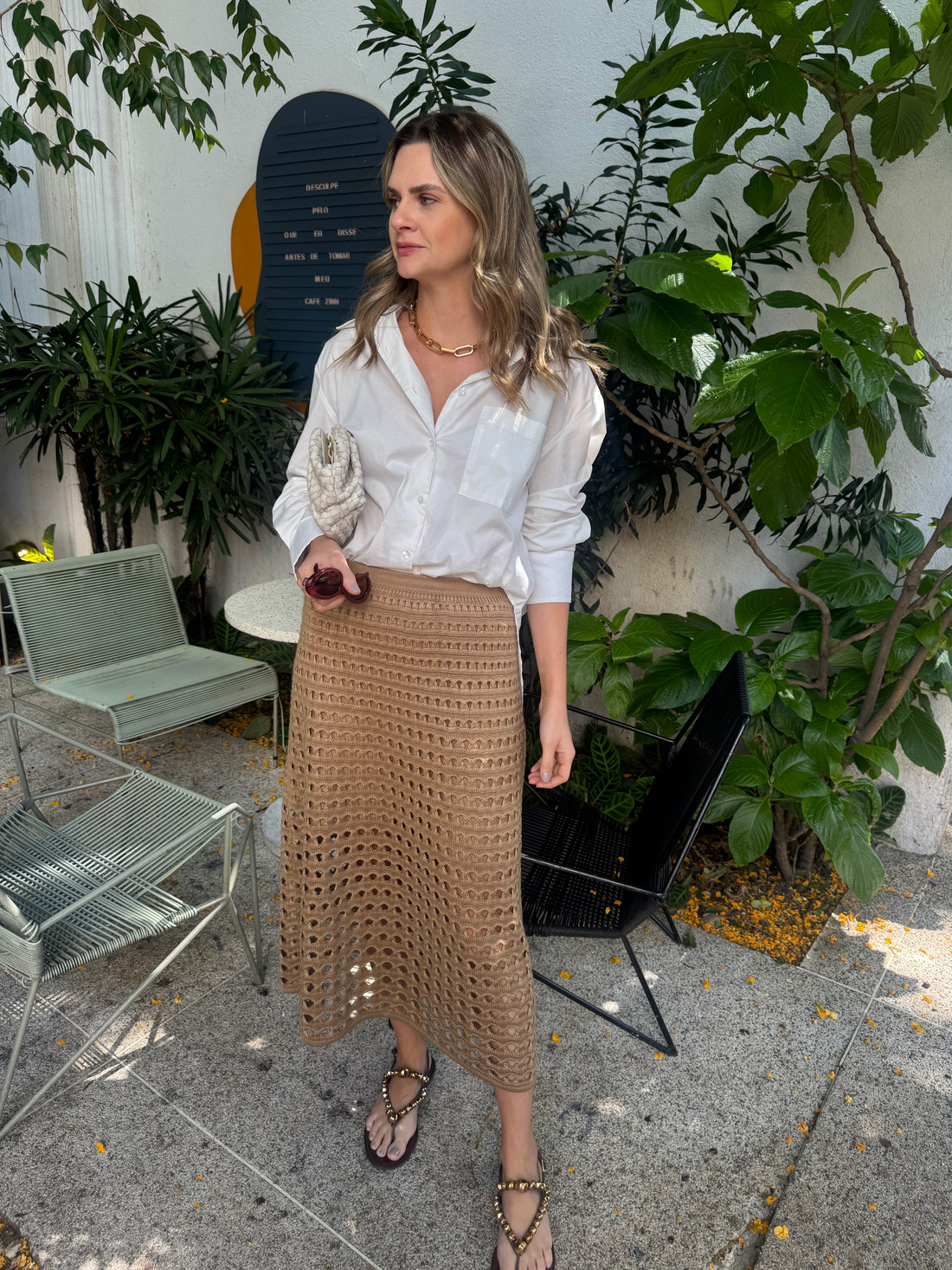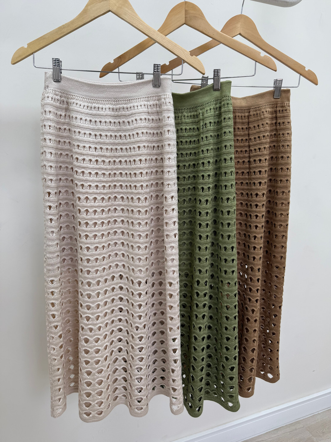 A Saia Dalila é confeccionada em tricôt com padrão vazado, oferecendo um toque sofisticado. Possui elástico na cintura para um ajuste confortável e comprimento midi, ideal para diversas ocasiões. Com forro embutido, garante conforto e um caimento elegante, tornando-se uma peça versátil para compor looks estilosos.