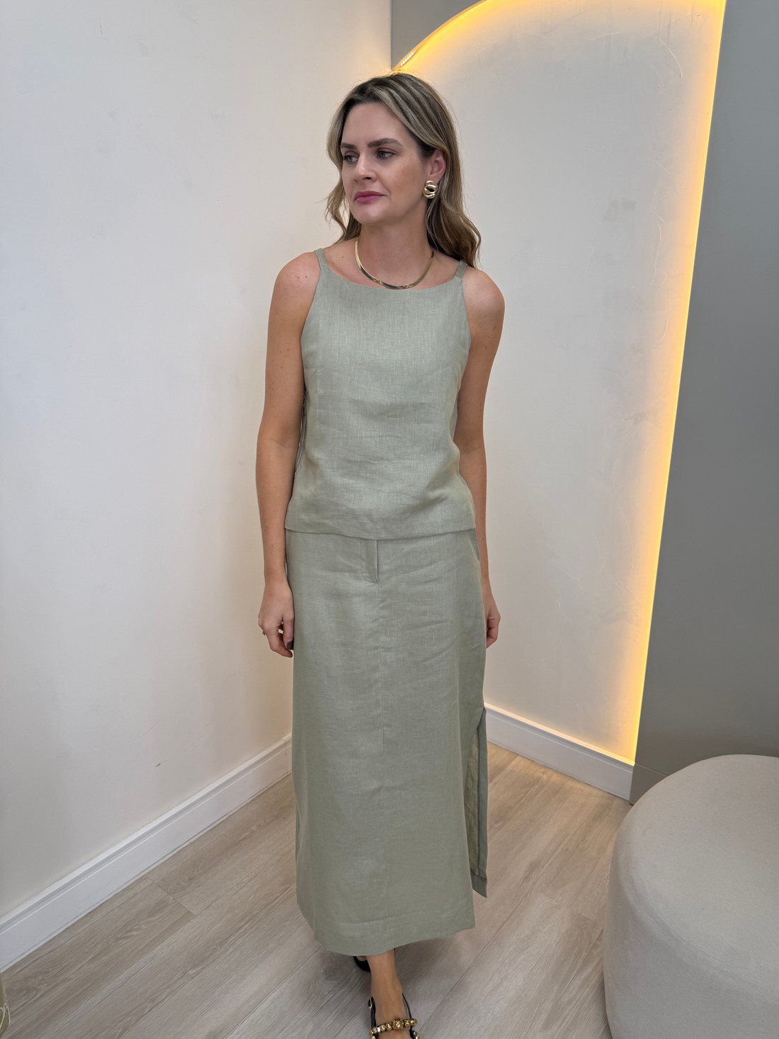 A Saia de Linho com Fenda Valentina é aquela peça que combina sofisticação natural com praticidade no dia a dia. Confeccionada em 100% linho puro, ela oferece frescor, caimento estruturado e acabamento impecável, enquanto o forro embutido garante conforto e segurança ao vestir. O design conta com uma fenda lateral única, que adiciona movimento e um charme elegante sem exageros. A peça também possui bolsos laterais na parte da frente e bolsos traseiros, trazendo ainda mais funcionalidade e um toque casual chic ao visual.