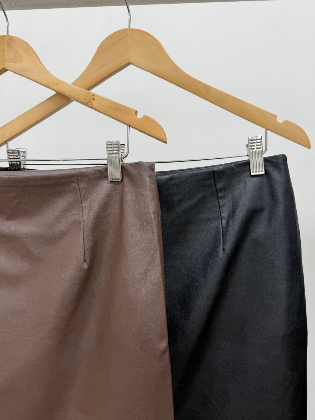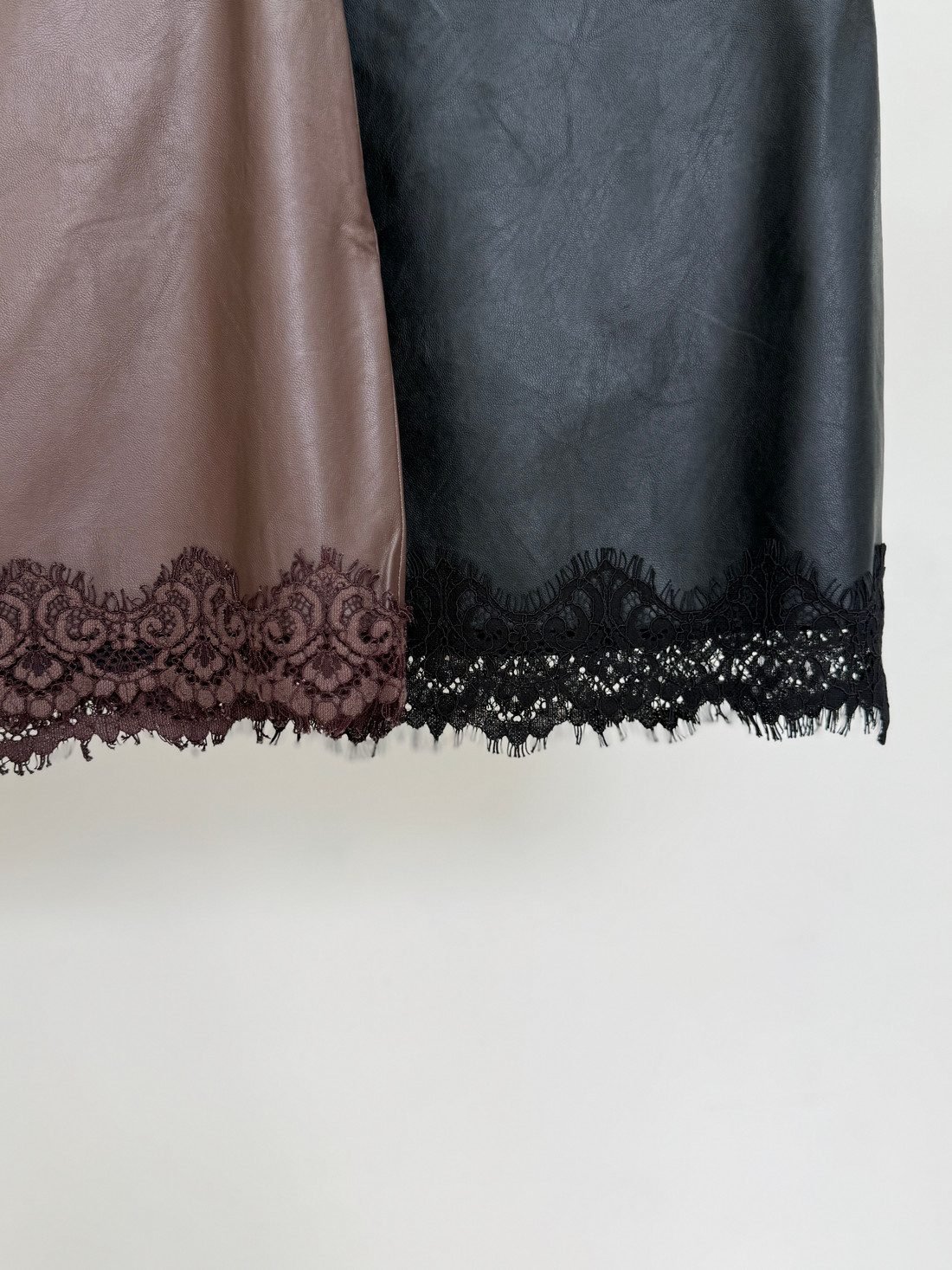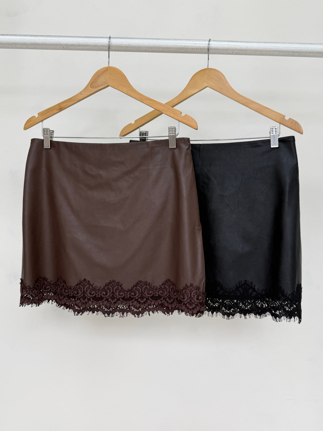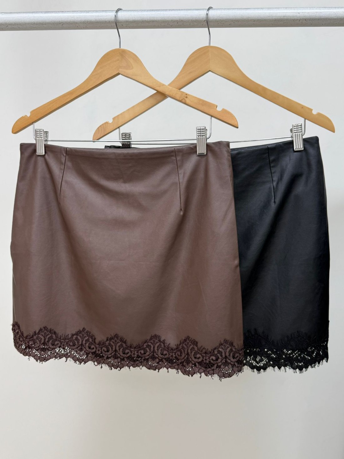 A Saia Camille é confeccionada em viscose com acabamento em couro ecológico, proporcionando toque macio e aparência sofisticada. Apresenta modelagem reta com caimento elegante que valoriza a silhueta. Possui fechamento por zíper lateral, garantindo praticidade e ajuste discreto ao corpo. O grande destaque da peça está na barra, finalizada com aplicação de renda preta delicada, que cria um contraste refinado e adiciona um toque feminino e sofisticado ao visual