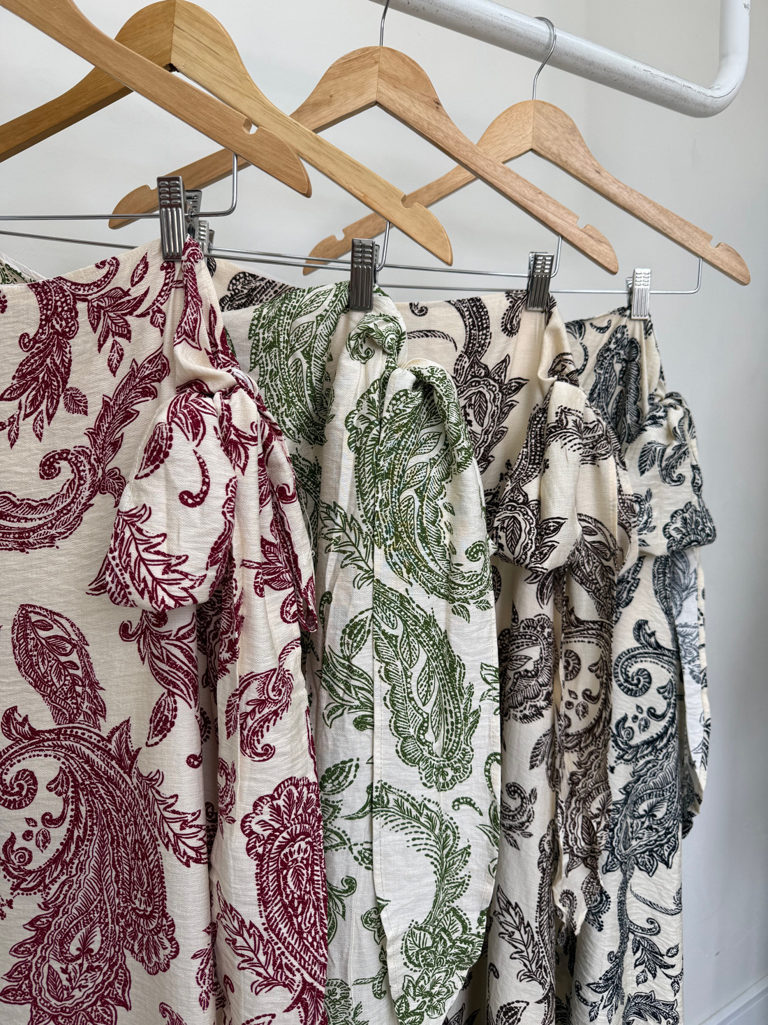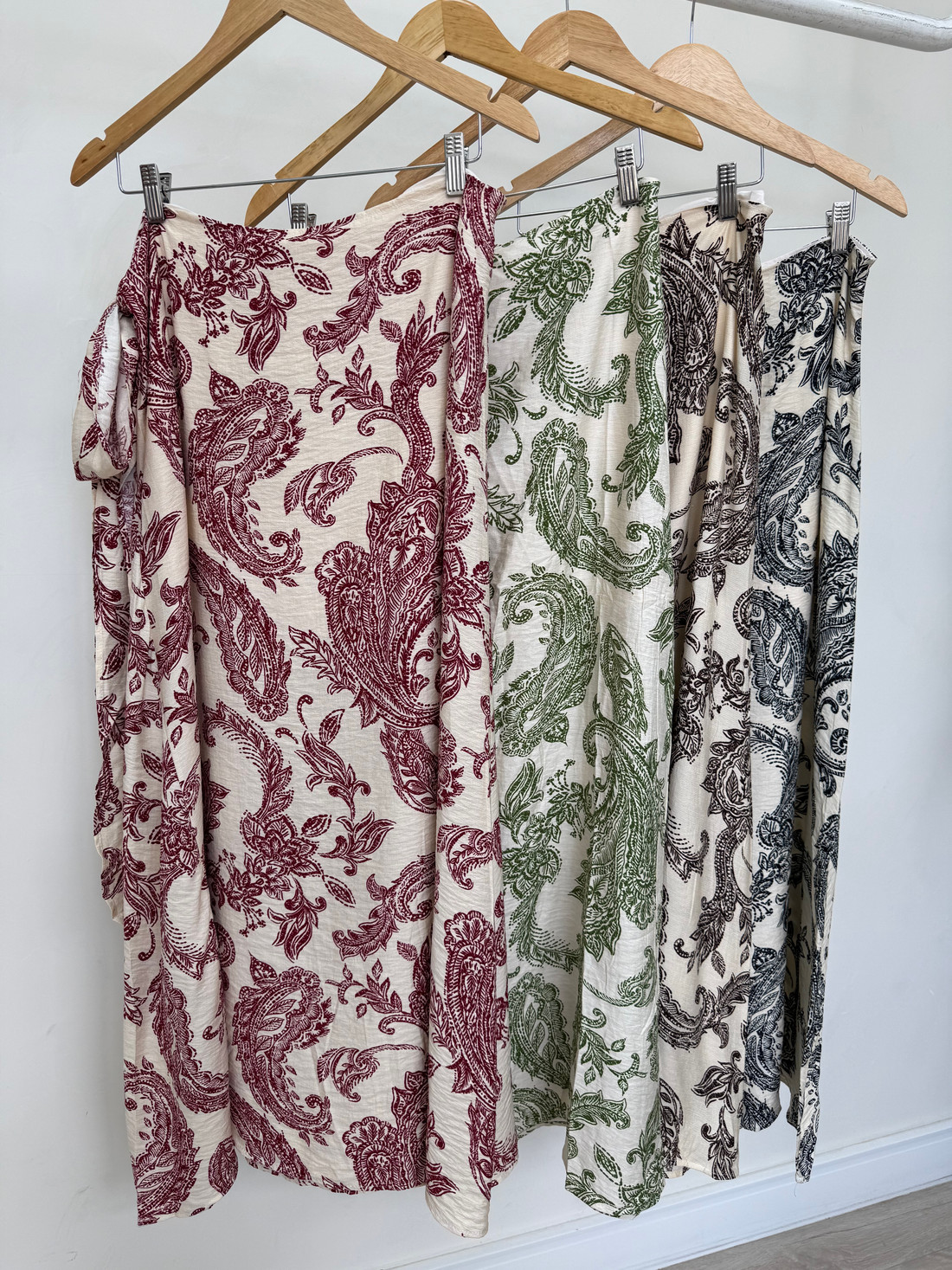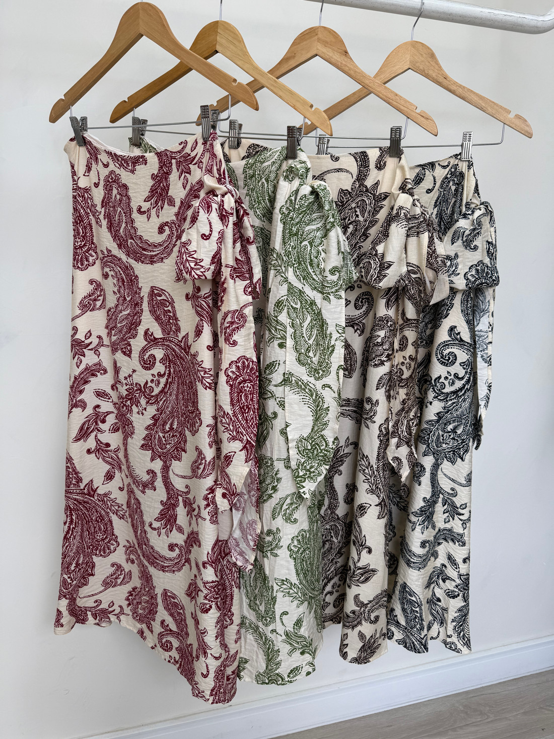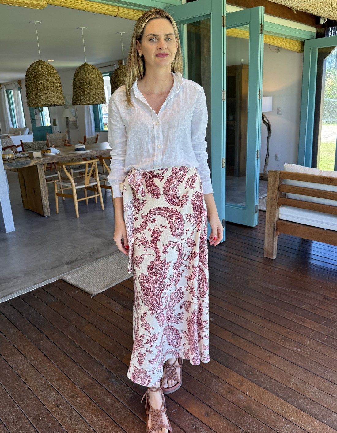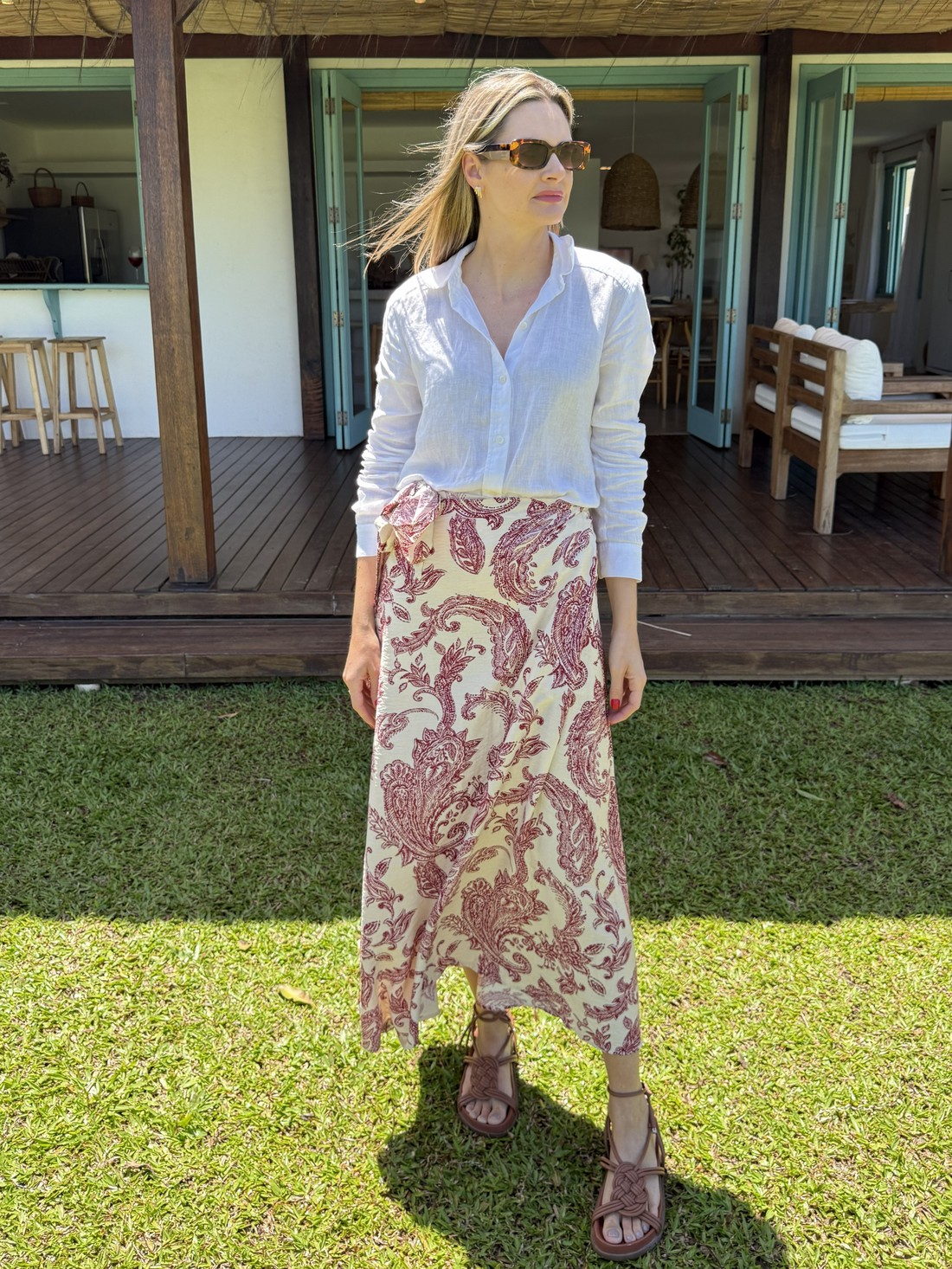 Confeccionada em viscose com poliamida, a Saia Estampada Gardênia tem toque suave e caimento fluido perfeita para dias quentes. A estampa paisley traz personalidade imediata, com aquele mood boho sofisticado que está super em alta. O grande destaque fica por conta da faixa embutida na própria saia, que permite ajustar a amarração de forma prática e estilosa, criando um visual transpassado que valoriza a silhueta. O forro interno garante segurança total no uso, evitando transparências e deixando a peça ainda mais confortável.