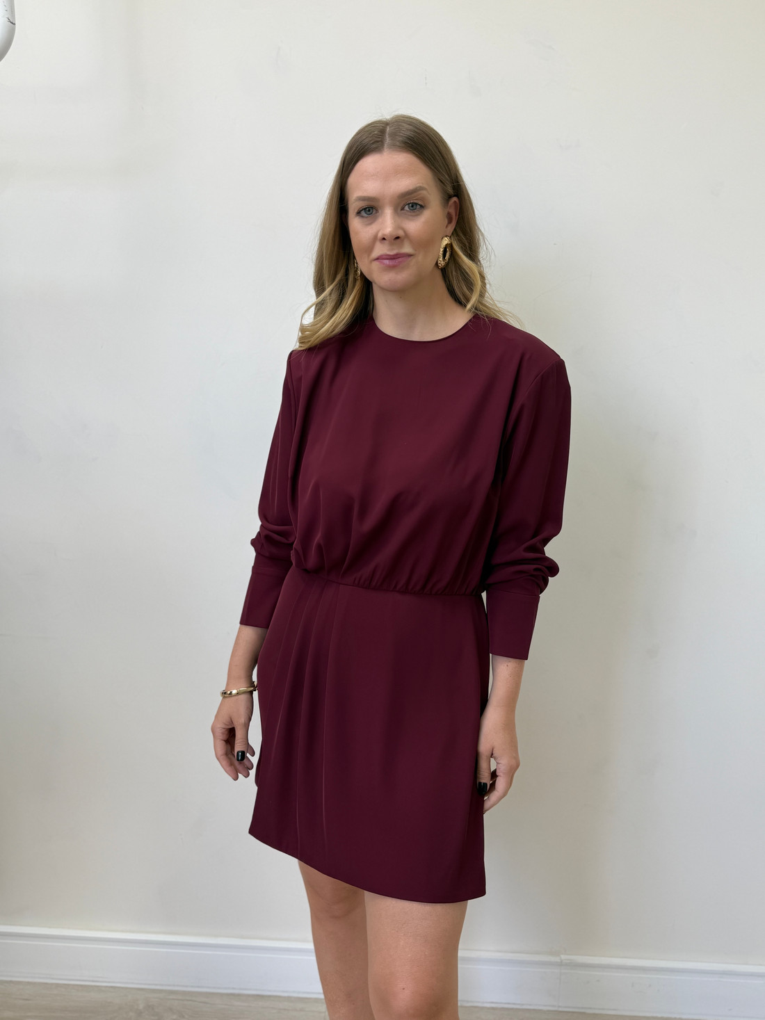 cmO Vestido Drapeado Mayla é Confeccionado em alfaiataria fluida, tecido de estrutura leve e caimento suave que une elegância e conforto. Possui toque macio e movimento delicado, proporcionando um visual sofisticado e acabamento impecável. O modelo apresenta decote arredondado, fechamento por zíper nas costas, pregas frontais que valorizam a silhueta e mangas compridas com fechamento por botão. O comprimento curto traz um toque moderno à peça, equilibrando o design elegante com uma proposta contemporânea.