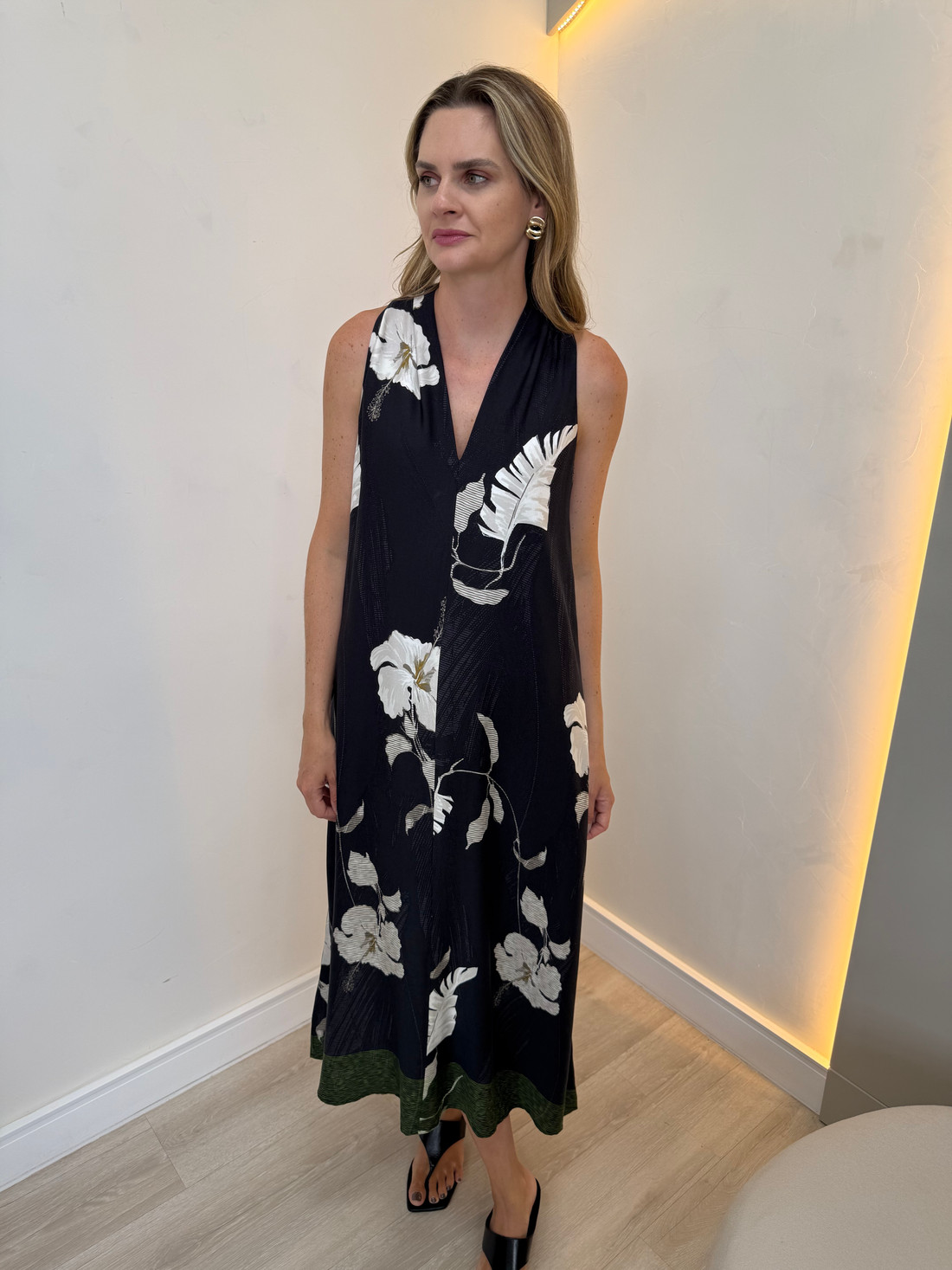 O Vestido Estampado Alicia é confeccionado em viscose leve e fluida, proporcionando conforto e frescor. O modelo longo possui modelagem soltinha e decote em V na parte frontal, que alonga o colo e confere feminilidade ao visual. As cavas amplas garantem leveza e liberdade de movimentos. Na parte posterior, o vestido conta com detalhe de amarração no decote, acrescentando charme e um acabamento diferenciado à peça. O modelo possui forro interno, oferecendo maior conforto e segurança ao vestir, além de bolsos laterais funcionais. A estampa em tons contrastantes traz sofisticação e versatilidade, permitindo o uso em diversas ocasiões.