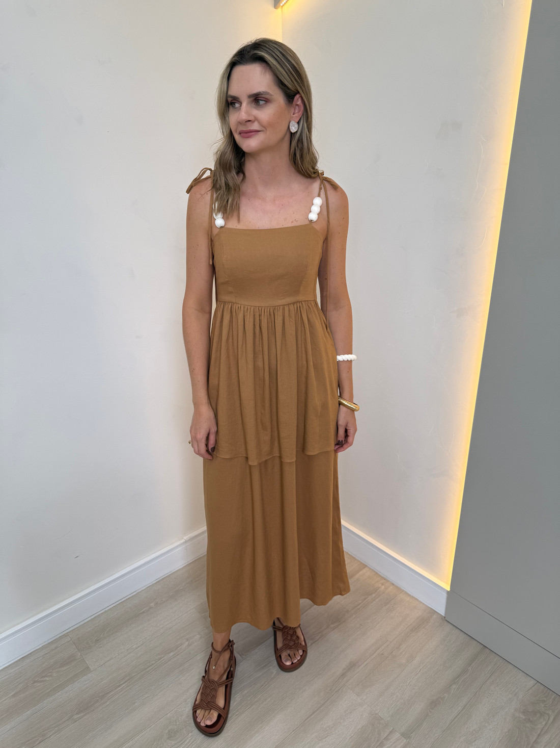 Confeccionado em viscose com linho, o Vestido Midi Babi une o frescor natural das fibras ao toque leve e fluido que garante conforto durante todo o dia. O modelo possui busto estruturado com recorte reto e caimento solto a partir da cintura, criando uma silhueta elegante e contemporânea. As alças finas com contas e amarração ajustável trazem charme artesanal e um toque diferenciado à peça, enquanto o zíper lateral invisível assegura um vestir prático e com ótimo caimento.