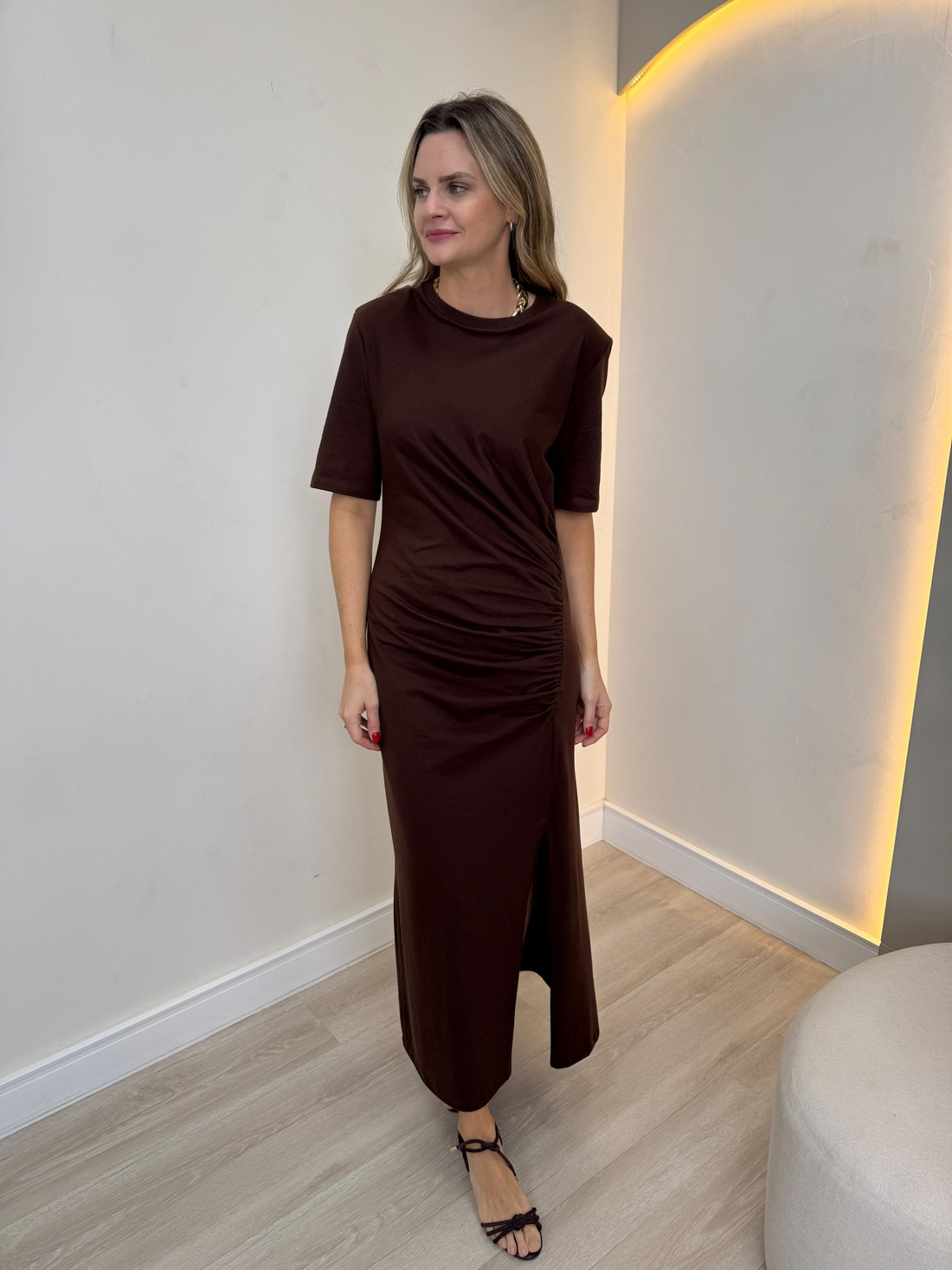 Minimalista e elegante, o Vestido Midi Drapeado Laura é a escolha perfeita para unir conforto e sofisticação em uma peça única. Com modelagem reta, o vestido destaca-se por sua estrutura com ombreiras, que adicionam imponência ao visual e valorizam a silhueta de forma moderna e elegante. Confeccionado em 100% algodão, o tecido proporciona toque suave, alta respirabilidade e conforto extremo para o dia a dia. A ausência de mangas equilibra o caimento estruturado dos ombros, deixando o look leve e atual. O detalhe drapeado na lateral cria um franzido estratégico que realça a cintura, enquanto a fenda lateral traz movimento, leveza e um toque de sensualidade sutil.